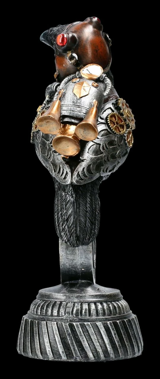 Wie festgenagelt sitzt der schwarze Rabe auf dem still stehenden Uhrwerk und kann nur wegfliegen, wenn es in einem magischen Moment gelingt, ihn aufzuziehen. Aber auf jeden Fall ist dem Rivet Raven jede Aufmerksamkeit gewiss, so faszinierend sieht diese tolle Steampunk Skulptur aus. Fantastisch detailreich aus von Hand bemaltem Kunststein (Polyresin) gefertigt, sitzt der Rabe auf der Uhr, auf der zwar keine Zeiger, aber dafür verschiedene Rädchen zu sehen sind. Die vielen technischen Details der 24 cm hohen, 13 cm breiten und 9 cm tiefen Steampunk Büste wirken wie aus Metall gefertigt. Rivet Raven ist nicht nur für Steampunk Fans eine tolle und außergewöhnliche Deko und auch ein besonders ausgefallenes Geschenk..