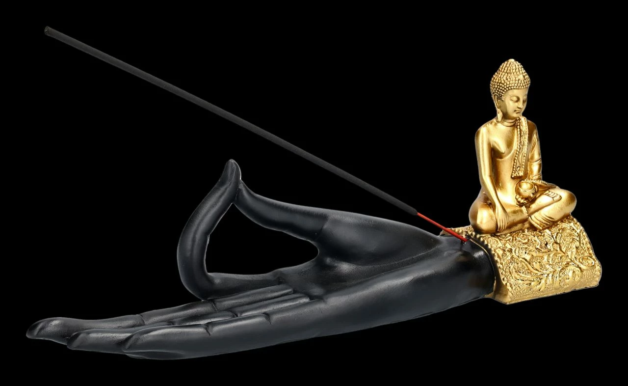 Auf dem reich verzierten goldenen Ärmelabschluss dieser schwarzen glänzenden Hand sitzt tief in seine Meditation versunken ein goldener Buddha. Während sein rechter Arm zur Erde zeigt, hält er mit der linken Hand die Schale der Weisheit. Die glänzend schwarze Hand bildet die Auffangschale für diesen wunderbaren Räucherhalter. Sie zeigt die Mudra-Geste der Bewegung des Dharma-Rades und symbolisiert die Lehre und steht für einen nicht enden wollenden Energiefluss. Mit der Buddha-Figur auf der Hand ist dieser Räucherhalter 9,5 cm hoch, 24 cm breit und 4,5 cm tief. Er wurde aus sorgfältig handbemaltem Kunststein (Polyresin) gefertigt und wirkt durch die schwarz-goldene Farbgebung sehr edel. Dieser schöne Räucherhalter ist auch ein perfektes Geschenk. Die Lieferung erfolgt ohne Räucherstäbchen, die Sie jedoch in vielen Duftrichtungen in unserem Shop finden.