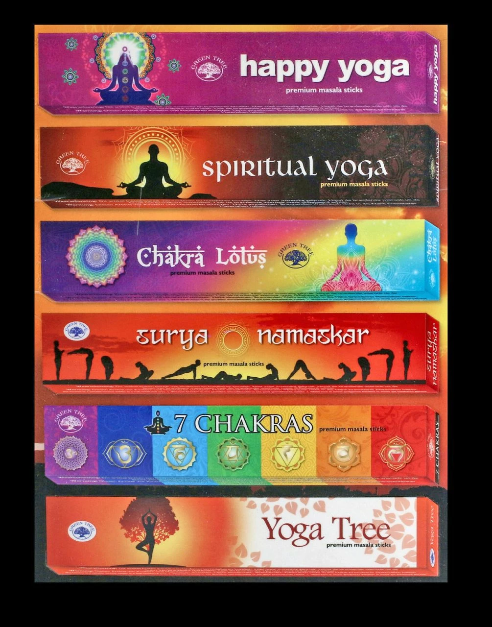 Die Green Tree Yoga-Kollektion enthält 6 verschiedene Masala-Räucherstäbchen