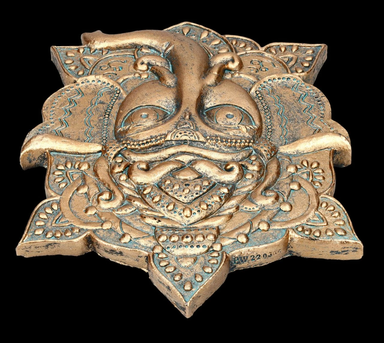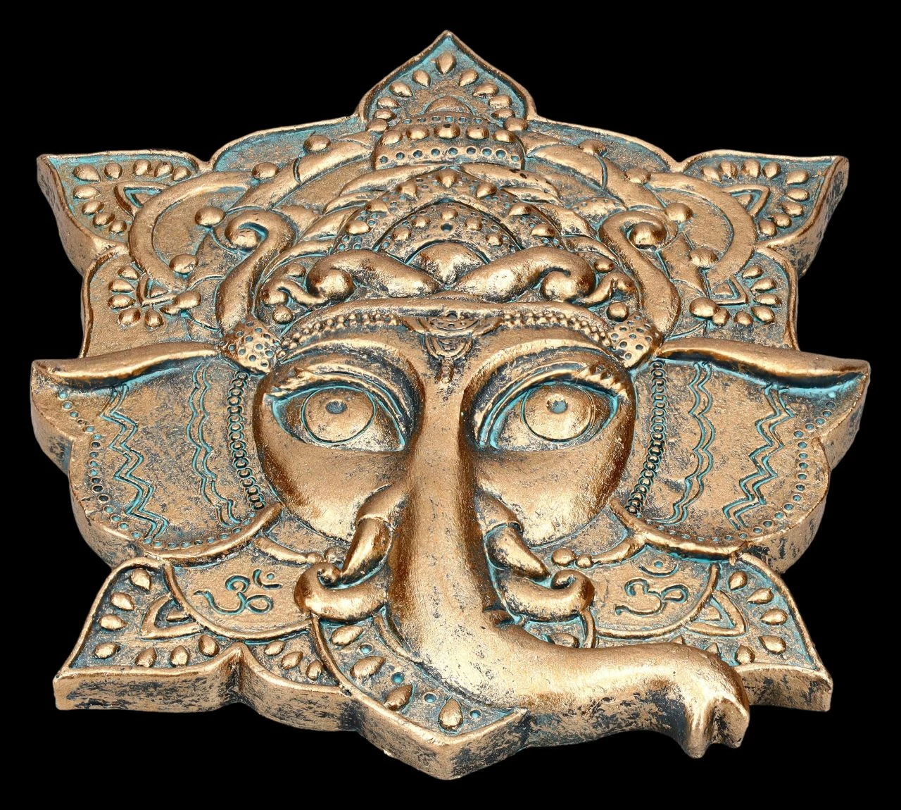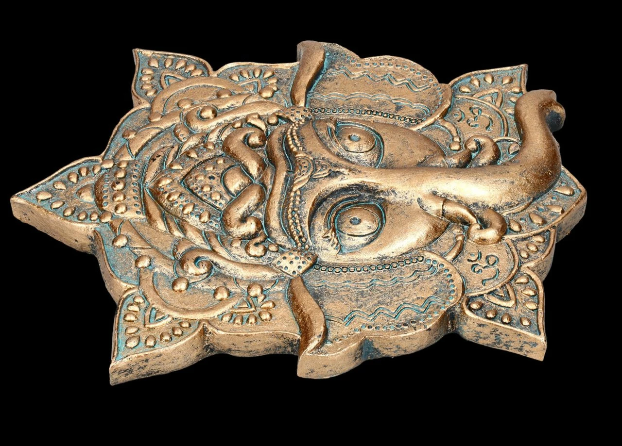 Der Kopf des nicht nur in asiatischen Ländern sehr beliebten elefantenköpfigen Gottes Ganesha bildet die Fläche für den schönen Räucherstäbchenhalter.Er ist aus liebevoll handbemaltem Kunststein (Polyresin) gefertigt und 1 cm hoch, 12 cm breit und 14,5 cm tief. Der Räucherstäbchenhalter mit dem Ganesha Kopf bringt asiatisches Feeling in jedes Ambiente und ist auch als Glücksbringer ein perfektes Geschenk. Die Lieferung erfolgt ohne Räucherstäbchen, die jedoch in vielen Duftrichtungen in unserem Shop zu finden sind.