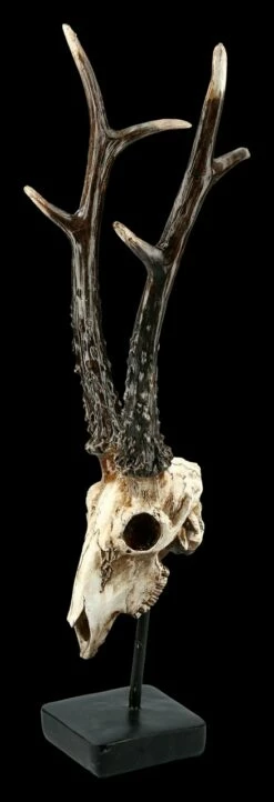 Ob im Wohnbereich oder in Ihrem Arbeitsbereich, dieser ungewöhnlich dekorative Totenkopf eines Rehbocks mit den langen Hörnern wird überall mit Sicherheit alle Blicke auf sich ziehen. Der schön geformte Rehbock-Schädel ist sehr aufwändig und detailreich aus Kunststein (Polyresin) gefertigt und mit großer Sorgfalt handbemalt. Der Schädel ist auf einem Metallständer befestigt und wirkt durch seine elegante, schmale Silhouette beeindruckend effektvoll. Mit seiner Gesamthöhe von 51 cm, wobei der Schädel eine Höhe von 44 cm hat, der Breite von 20 cm und der Tiefe von 11 cm ist dieser Rehbock-Schädel mit den langen Hörnern eine wirklich außergewöhnliche Dekoration.