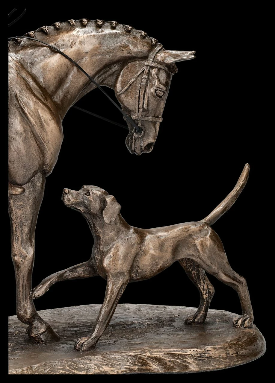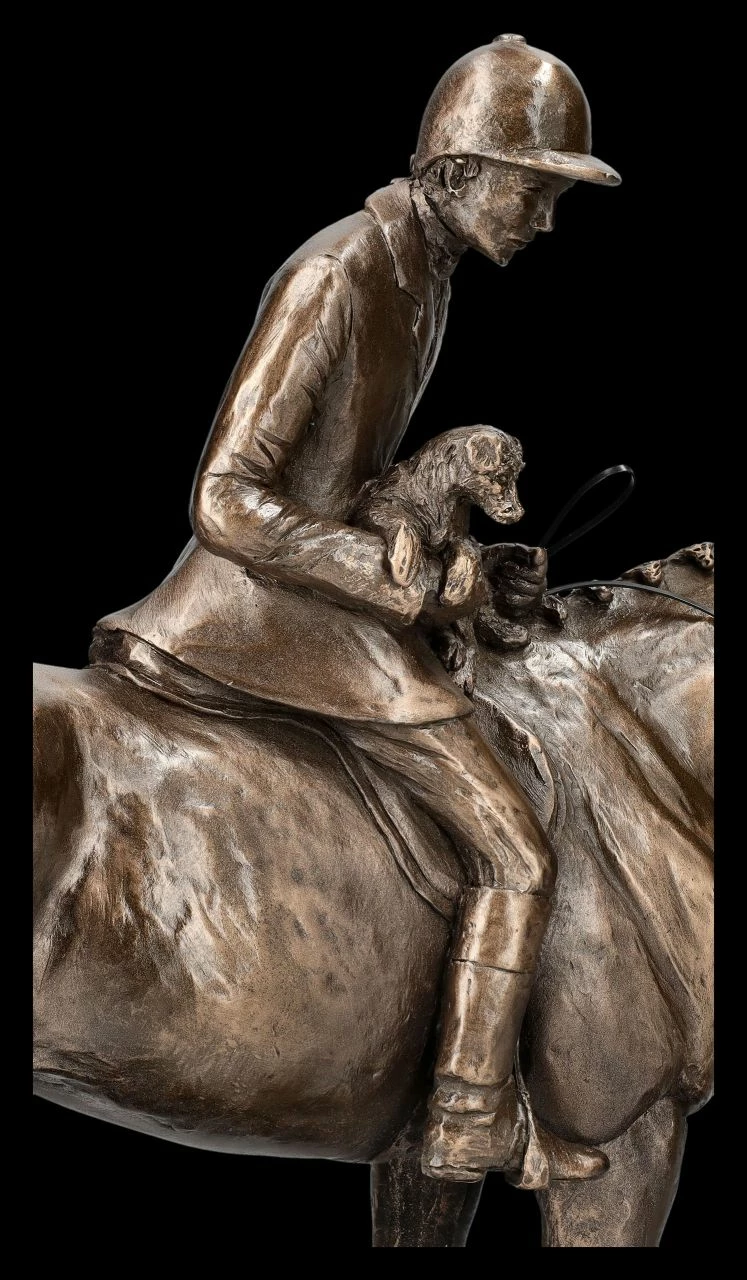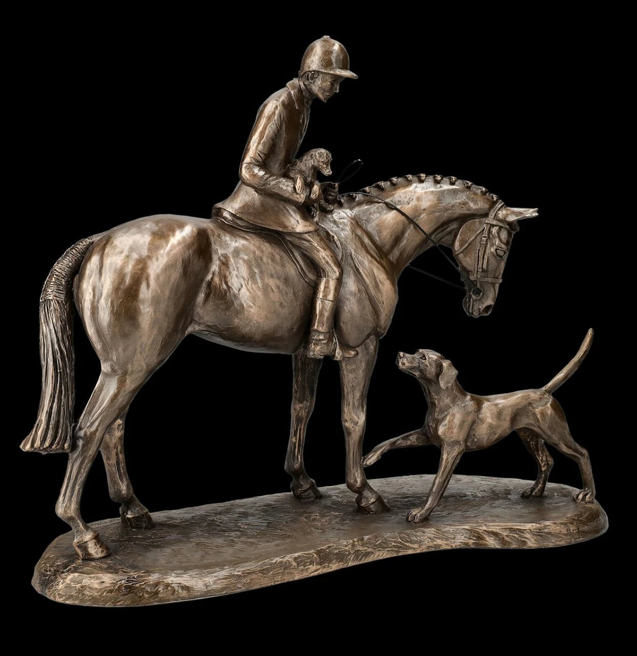 Schon als Kind baute die Künstlerin Harriet Glen ihre ersten Pferde aus Ton und bekam schon mit 8 Jahren ihr erstes Pony. Bevor sie später nach Dorset in England ging, unterrichtete sie in Sydney Kunst und engagierte sich für den Pferdesport. Sie liebt das Landleben in England und die Tiere – das sieht man ihren bei Sammlern sehr beliebten Pferde- und Hunde-Skulpturen auch an. Bei diesem, mit seinem kleinen Hund auf dem Pferd sitzenden Jäger steht sein großer Jagdhund daneben. Er hebt die Pfote und blickt sehnsüchtig nach oben, denn offensichtlich möchte auch er mit auf das Pferd. Die Reiter Figur mit dem Jäger und Hund ist bei dieser herrlichen Skulptur aus hochwertigem, sorgfältig bronziertem Kunststein (Polyresin) einfach fantastisch detailreich dargestellt. Sie ist 29 cm hoch, 35 cm breit und 14,5 cm tief und wirkt sehr hochwertig und edel. ‚Country Companions‘ ist nicht nur für Pferdeliebhaber, Jäger und alle, die das englische Landleben lieben, ein perfektes Geschenk, sondern auch für Sammler und Fans der Künstlerin Harriet Glen.