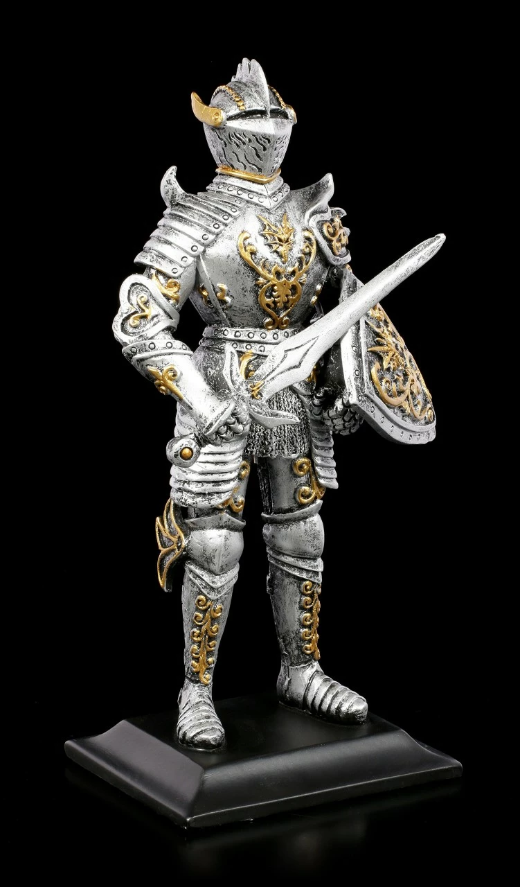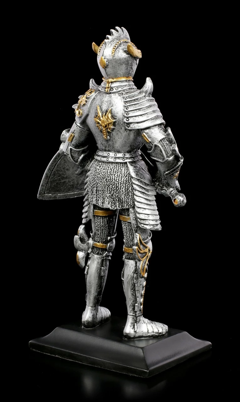 Die detailreiche Ritter Rüstung aus Kunststein (Polyresin) wurde handbemalt und wird Sie als Mittelalterfan begeistern. Die reich verzierte Ritter Rüstung auf schwarzem Sockel ist eine wunderbare Ergänzung zu jeder mittelalterlichen Sammlung. Das Schild des Ritters ziert ein Drachenkopf.