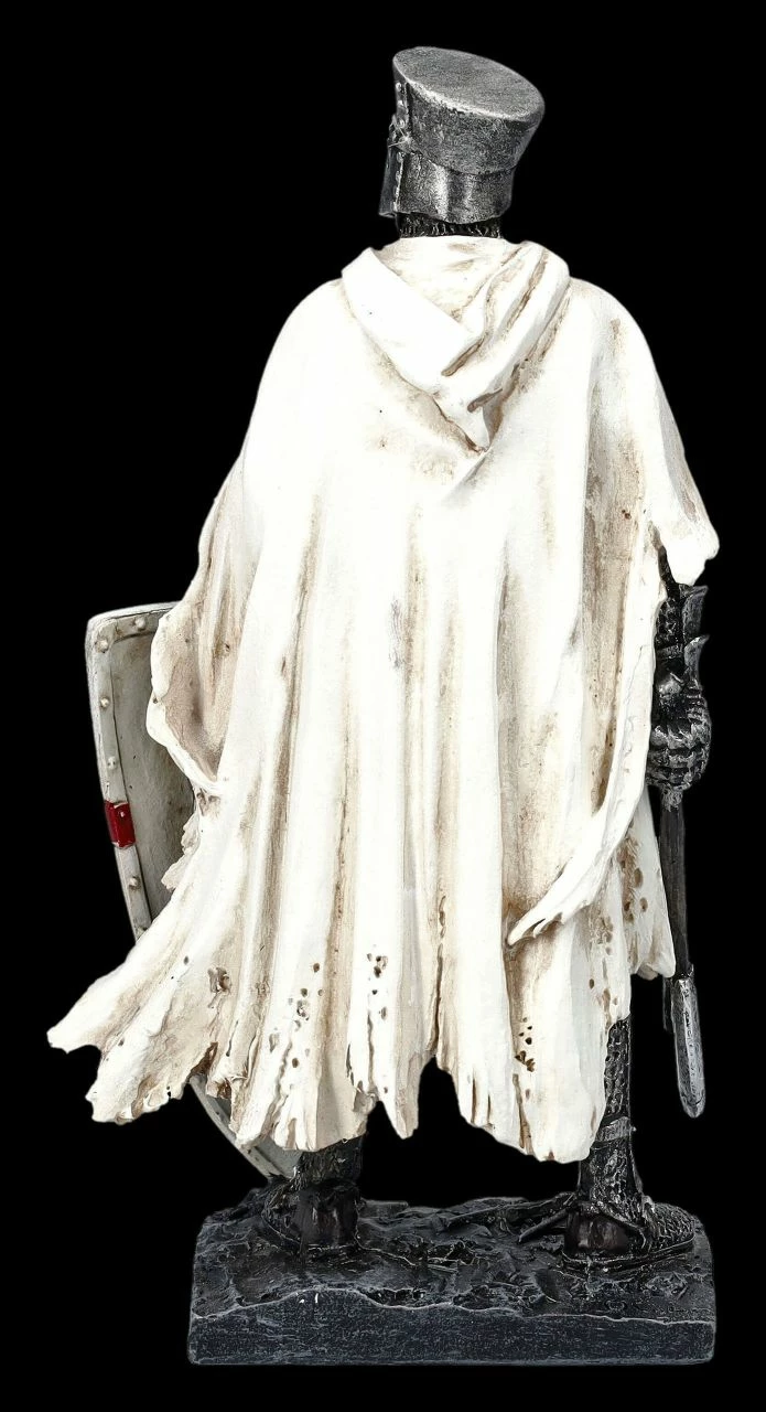 Eine wunderbare Ergänzung für jede Rittersammlung ist diese 19 cm hohe, 10 cm breite und 6 cm tiefe Figur eines Templers. Breitbeinig sicher steht der Ritter in seinem weißen Umhang mit dem roten Kreuz auf der Brust auf seinem Standplatz. In der rechten Hand hält er eine Axt und mit der linken das weiße Schild mit rotem Kreuz, das vor seinen Knien noch fest am Boden steht. Der Kopf mit dem geschlossenen Ritterhelm ist zur Seite gedreht, so dass es wirkt, als würde er auf seinen Befehl zum Angriff warten. Die Figur des Templers mit der Axt wurde detailreich aus handbemaltem Kunststein (Polyresin) gefertigt und ist ein fantastisches Geschenk für Templer und Ritter passt hervorragend zu den weiteren Templer-Figuren aus unserem Shop.