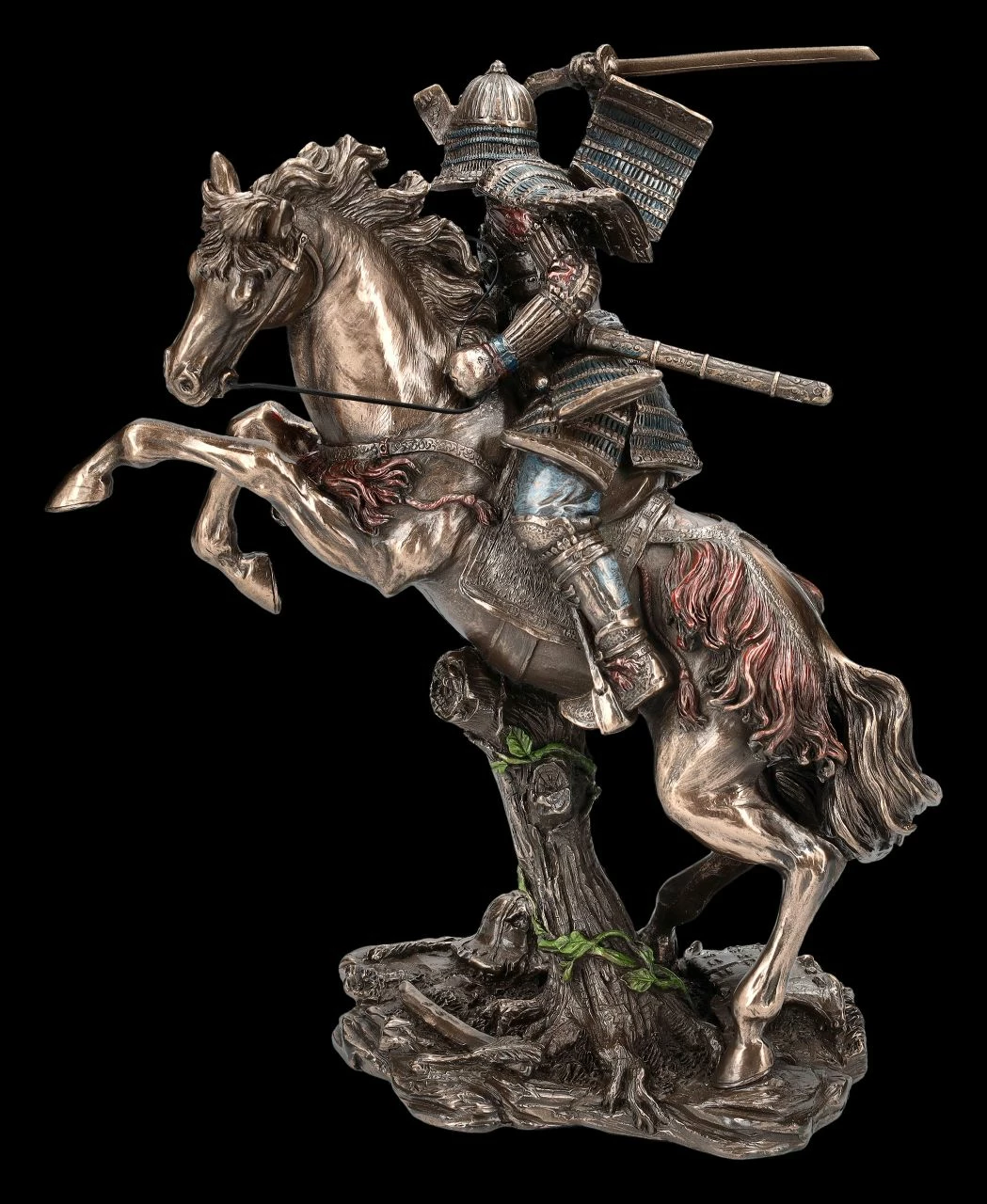 Ursprünglich waren Samurai Diener im Sicherheitsdienst des japanischen Kaisers. Sie verteidigten mutig und kräftig mit ihrem Leben den Kaiser und gewannen als Krieger immer mehr Einfluss. Samurai waren als große Krieger, Strategen und gute Reiter geschätzt und auch gefürchtet. Katana hieß das gebogene Schwert, das sie am Gürtel trugen und meistens hatten sie auch ein zweites Kurzschwert bei sich. Diese wunderbare Samurai Figur aus edel bronziertem und fein und zurückhaltend coloriertem Kunststein (Polyresin) stammt aus der Studio Collection von Veronese. Sie stellt wunderbar detailreich einen mutigen Krieger in Rüstung in voller Action dar. Der Samurai auf seinem steigenden Pferd ist eine fantastische, edle Deko und ein sofortiger Blickfang auf jedem Sideboard.