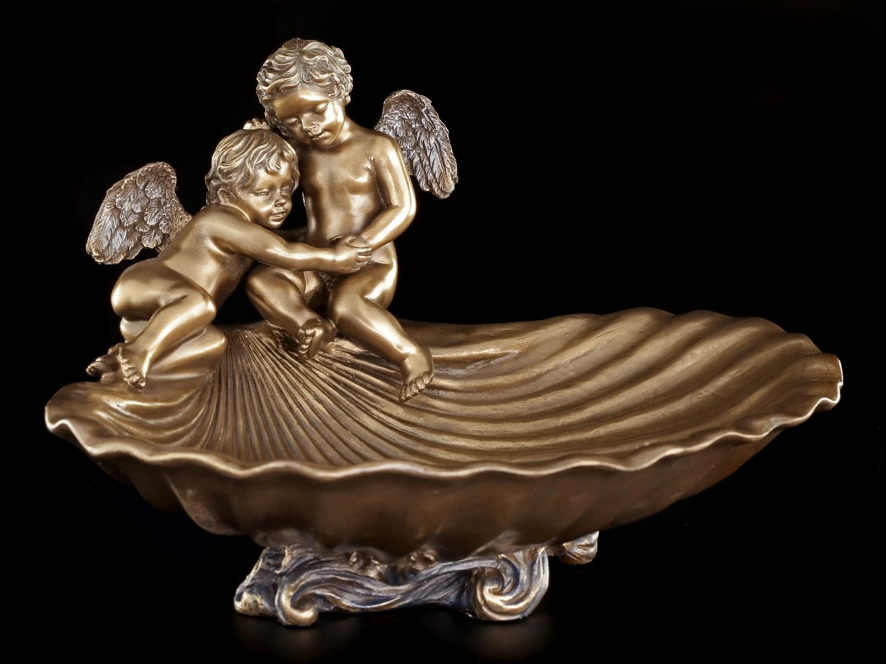 Diese schöne Schale wird zu dem Hingucker auf einem Tisch. Zwei kleine Engel sitzen an dem Rand einer Muschel. Die Bronzierung lässt die Schale im Licht sanft glänzen. In dieser Schale lassen sich kleine Wertsachen sicher und stilvoll ablegen.