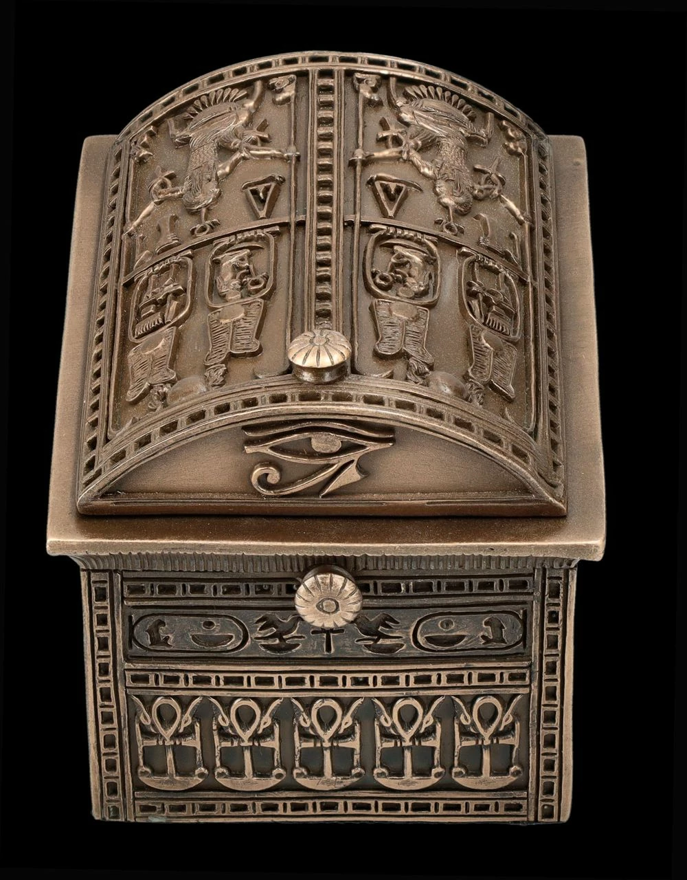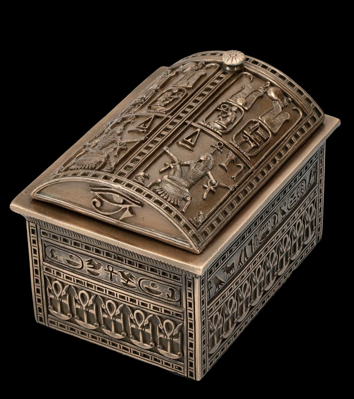 Schränke oder andere Möbel kannte man im alten Ägypten noch nicht. So wurde – wie man auch aus Grabbeigaben kennt – alles in Krügen, Körbe, Tüchern oder Kästchen verstaut. Die konnte man dann auch ganz leicht mitnehmen. Aber auch als Kanopenkasten wurden die oft wie richtige Kunstwerke verzierten Truhen verwendet. Die 9 cm hohe, 9 cm breite und 11,5 cm tiefe handbemalte und mit Hieroglyphen verzierte Schatulle in Form einer Ägyptischen Truhe ist detailreich aus Kunststein (Polyresin) gefertigt. Im Inneren hat sie mit H: 5,5 cm / B: 6,5 cm / T: 9,5 cm ausreichend Platz für besondere Kleinigkeiten und sie ist auch ein perfektes Geschenk für alle, die sich für das Alte Ägypten interessieren.