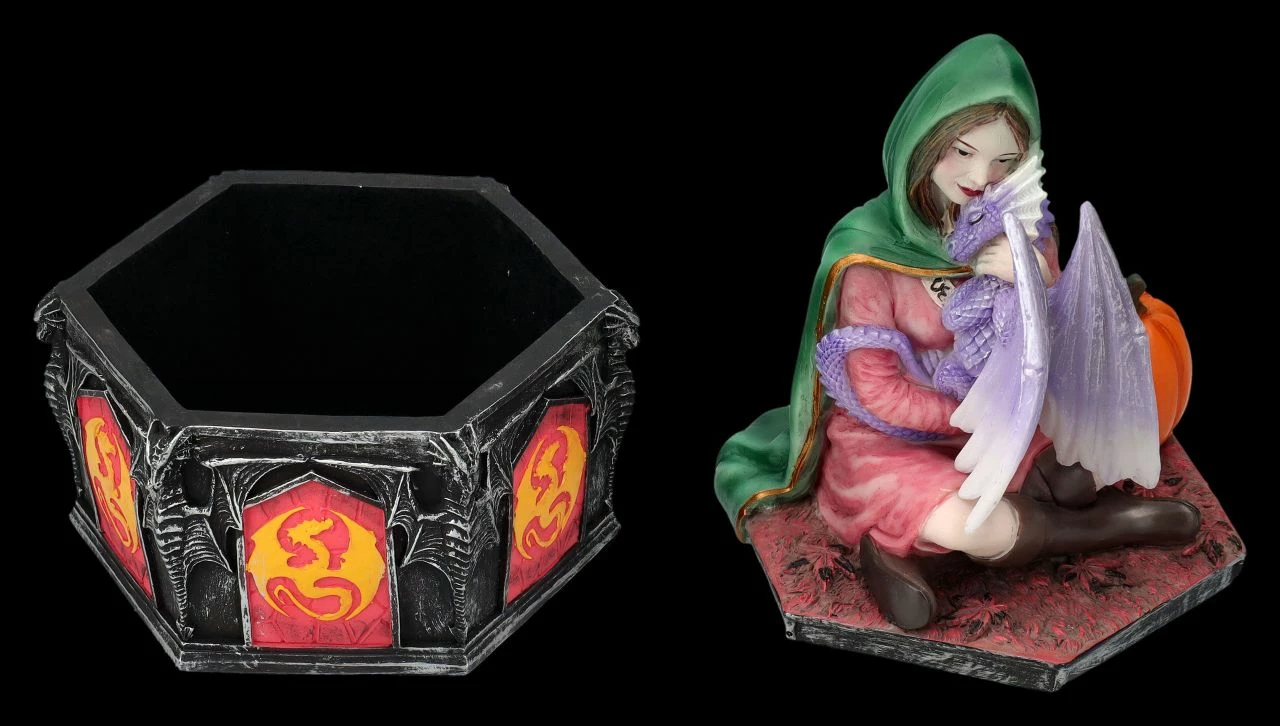In ihrem grünen Umhang über dem roten Kleid und Gummistiefeln sitzt die schöne Elfe auf dem herbstlich gefärbten Waldboden und hält zärtlich ihren kleinen violetten Drachen in den Armen. Eigentlich wollte sie nur schnell einen Kürbis für ihre Herbstdekoration holen, aber ihr Drache scheint sie schon sehr vermisst zu haben. Die kunstvolle Schatulle mit dem Motiv ‚Dragon Friendship – Herbst‘ der beliebten Fantasykünstlerin Anne Stokes ist absolut bezaubernd. Die aufwändig und liebevoll aus handbemaltem Kunststein (Polyresin) gefertigte Schatulle ist 19 cm hoch, 13 cm breit und 11,5 cm tief. Innen hat die zauberhafte Schatulle mit den Maßen H: 5,5 cm / B: 9 cm / T: 10 cm Platz für kleine Kostbarkeiten. Die Schatulle mit dem Drachenmotiv kommt inklusive eines toll bedruckten Geschenkkartons und ist für alle Freunde magischer Wesen und alle Anne Stokes-Fans ein wunderbares Geschenk. In unserem Shop gibt es übrigens weitere märchenhafte Motive aus dieser Serie.