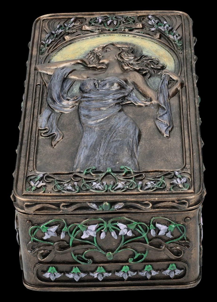 Florale und ornamentale Linien und wunderschöne Frauengestalten in fließenden Kleidern werden heute als Kennzeichen der Kunstrichtung um die Jahrhundertwende vom 19. zum 20. Jahrhundet erkannt. Jugendstil, oder auch Art Nouveau wie diese Epoche in Frankreich genannt wurde, war die Abkehr der bis dahin geltenden Regeln für bildende Kunst und so enstanden zwischen 1890 und 1910 nicht nur in Frankreich und Wien, sondern in zahlreichen ‚Künstlerenklaven‘ u.a. viele der heute berühmten dekorativen Gemälde und Skulpturen. Auf dieser wunderbaren Schatulle im Stil des Art Nouveau ist auf dem Deckel in graziler Pose ‚Lady Victoria‘ zu sehen. Umrandet wird das Bild, wie im Jugendstil üblich, von Blumenranken und Blüten. Die herrliche, 6,5 cm hohe, 10,5 cm breite und 21 cm tiefe Schatulle aus der Studio Collection von Veronese ist aus Kunststein (Polyresin) und wurde edel bronziert und wunderschön coloriert. Innen hat sie mit H: 5 cm / B: 8,5 cm / T: 19 cm ausreichend Platz, um z.B. besondere Erinnerungen oder Kostbarkeiten aufzubewahren. Diese Schatulle ist aber auch ein sehr dekoratives und schönes Geschenk oder auch eine perfekte Geschenkverpackung für etwas ganz Besonderes.