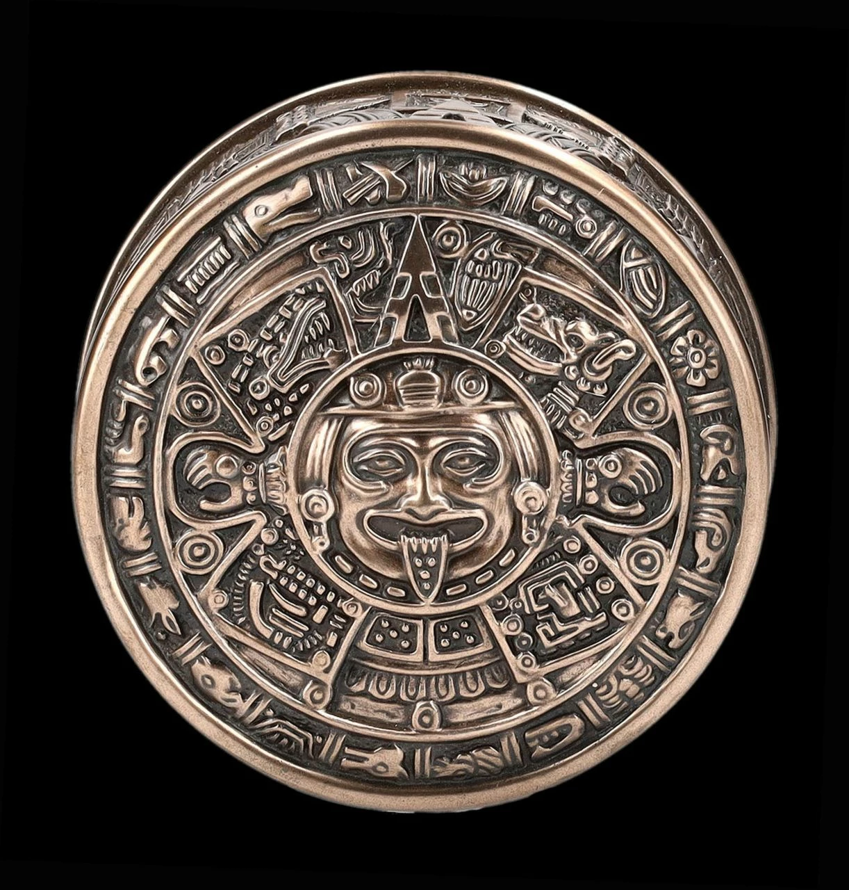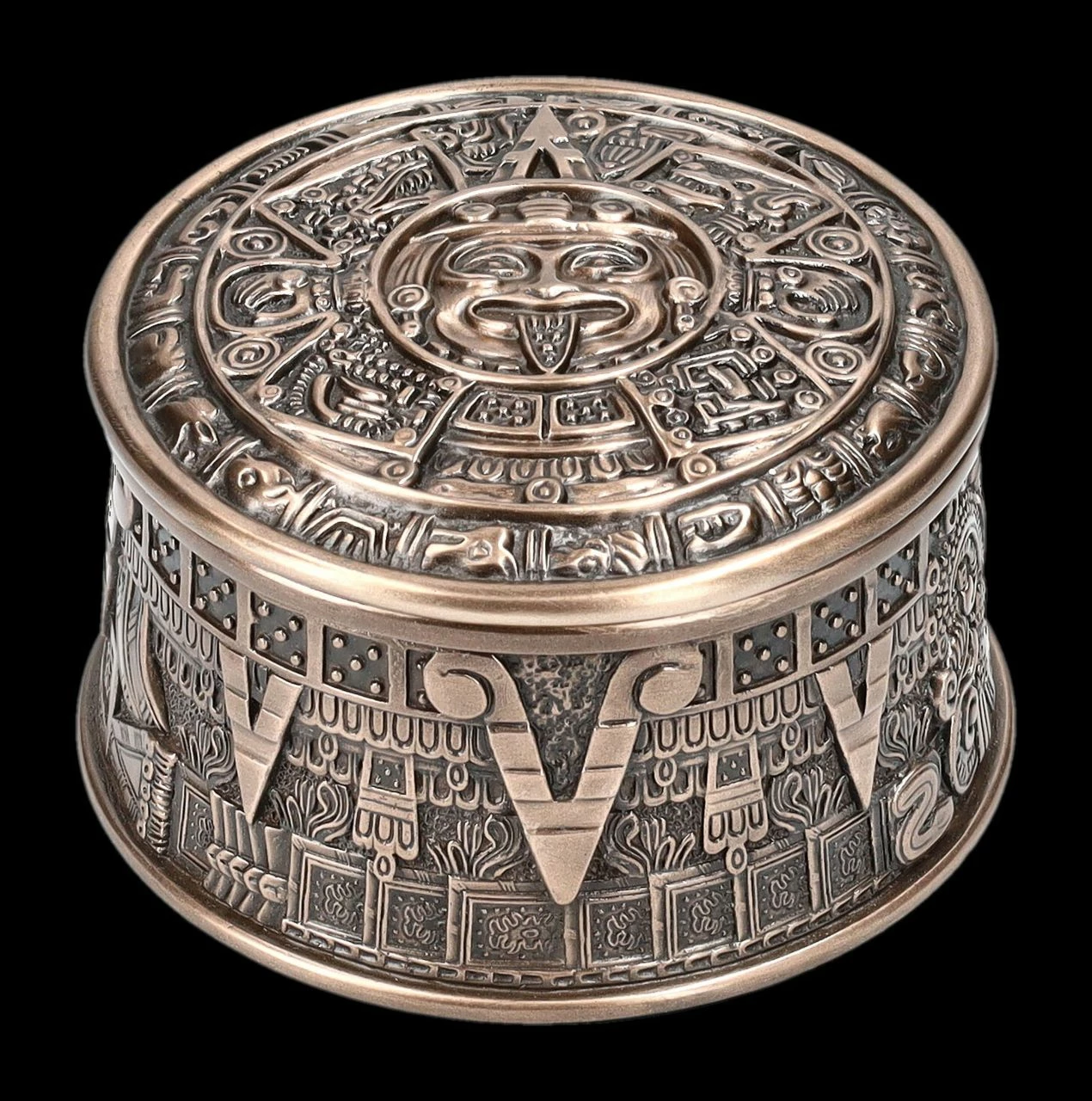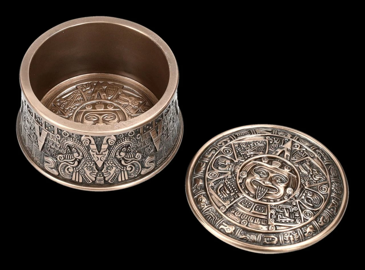 Ob kleine Kostbarkeiten oder auch Räucherwerk – in dieser 6 cm hohen Schatulle mit dem Durchmesser von 10 cm ist alles gut aufgehoben. Mit dem Azteken Sonnenkalender auf dem Deckel und den plastischen Verzierungen ist diese edel bronzierte Schatulle aus der Studio Collection von Veronese auch ein Blickfang und ein wunderbares Geschenk für jeden, der von der Kultur der Azteken fasziniert ist. Die fantastische Schatulle wurde aus hochwertigem Kunststein (Polyresin) gefertigt und ist mit den Innenmaßen von 4 cm Höhe und dem Durchmesser von 7,5 cm zum Beispiel auch als Verpackung für ein besonderes Geschenk hervorragend geeignet.