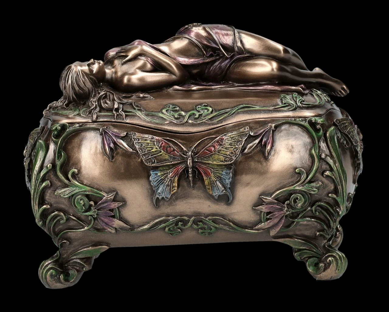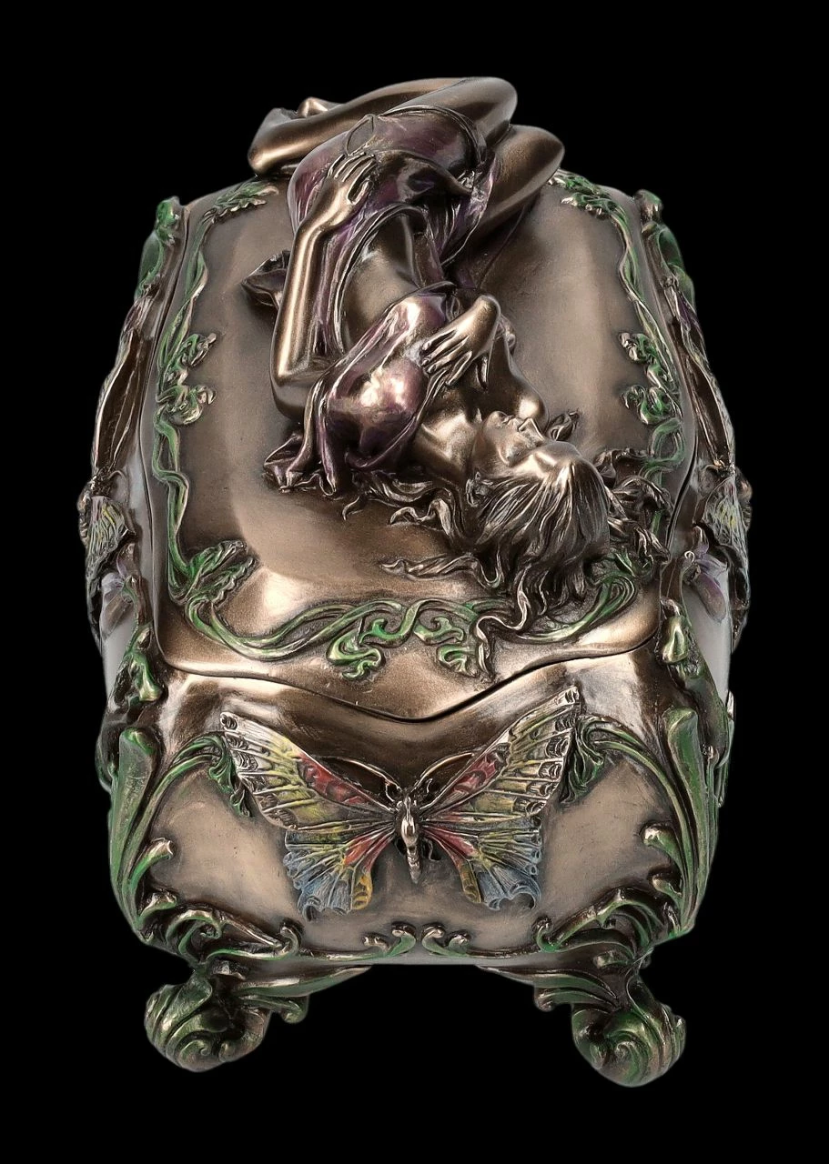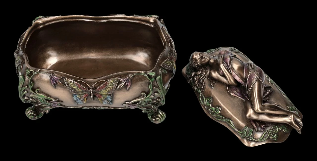 Diese wunderbare Schatulle aus der Studio Collection von Veronese im Art Nouveau Stil wird absolut jeden begeistern. Auf dem Deckel der herrlich verzierten, 11 cm hohen, 15 cm breiten und 10 cm tiefen Schatulle ruht in graziöser Haltung eine wunderschöne junge Frauengestalt. Die Schatulle wurde sehr detailreich aus Kunststein (Polyresin) gefertigt und edel bronziert und sehr fein und zurückhaltend coloriert. Egal wo sie hingestellt wird, diese unglaublich dekorative Schatulle wird sicher alle Blicke auf sich ziehen. Mit den Innenmaßen von H 5 cm x B 12,5 cm x T 7 cm ist sie aber auch eine prächtige Verpackung für ein ganz besonderes Geschenk.