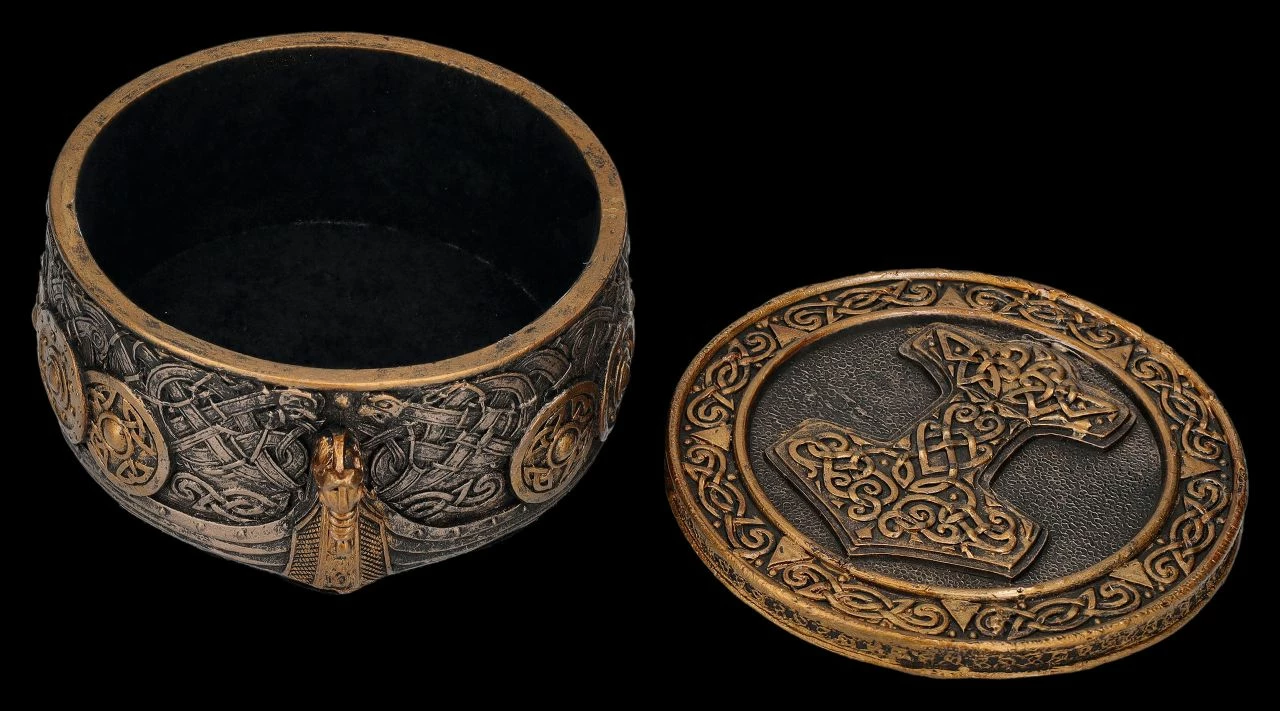 In dieser Schatulle können Wikinger ihre kleinen Schätzchen perfekt aufbewahren, denn Thors Hammer auf dem Deckel wird sie beschützen. Die faszinierende Schatulle aus handbemaltem Kunststein (Polyresin) wirkt mit den Verzierungen wie ein rundes Drakkar Schiff. Sie ist 5,5 cm hoch, 10 cm breit und 12 cm tief und hat innen mit H: 4 cm / B: 8,5 cm / T: 8,5 cm Platz für kleine Geheimnisse, Kostbarkeiten, oder was auch immer. Sie ist aber auch gleich als Verpackung für ein besonderes Wikinger-Geschenk perfekt geeignet.