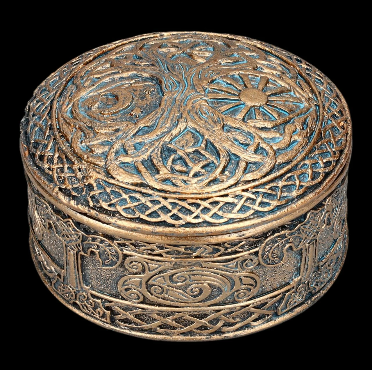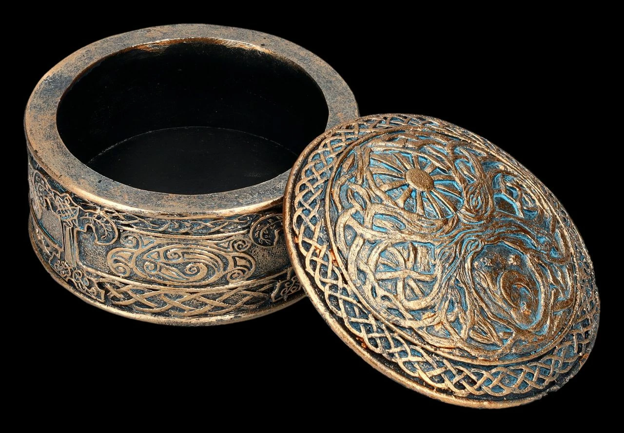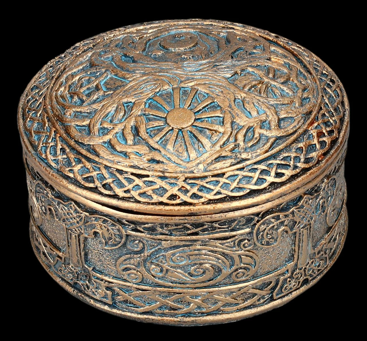 Yggdrasil, der Weltenbaum der Germanen, ziert neben zahlreichen nordischen Insignien diese edle Schatulle. Sie wurde außerordentlich detailreich aus fein handbemaltem Kunststein (Polyresin) gefertigt. Die 6,5 cm hohe Schatulle mit dem Durchmesser von 11 cm ist ein fantastisches Geschenk, sie kann aber auch wunderbar zum Beispiel als Verpackung für ein Schmuckstück dienen. Innen hat die herrliche Schatulle mit der Höhe von 4 cm und dem Durchmesser von 8,5 cm Platz für ein besonderes Kleinod.