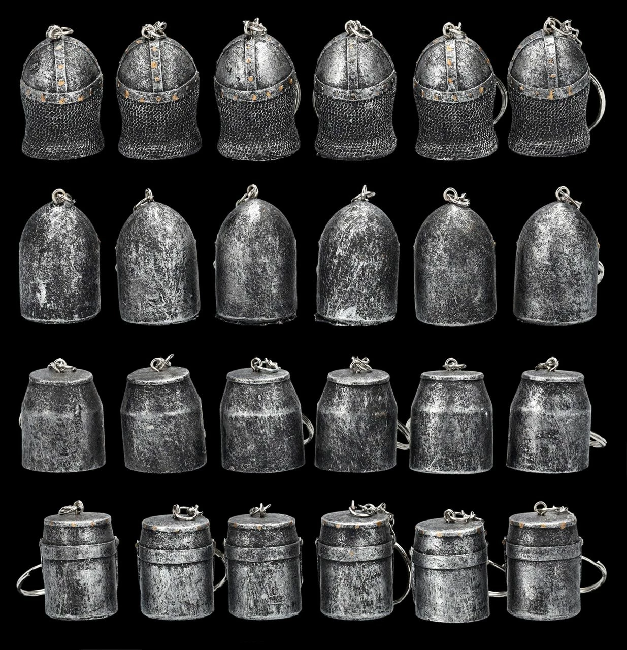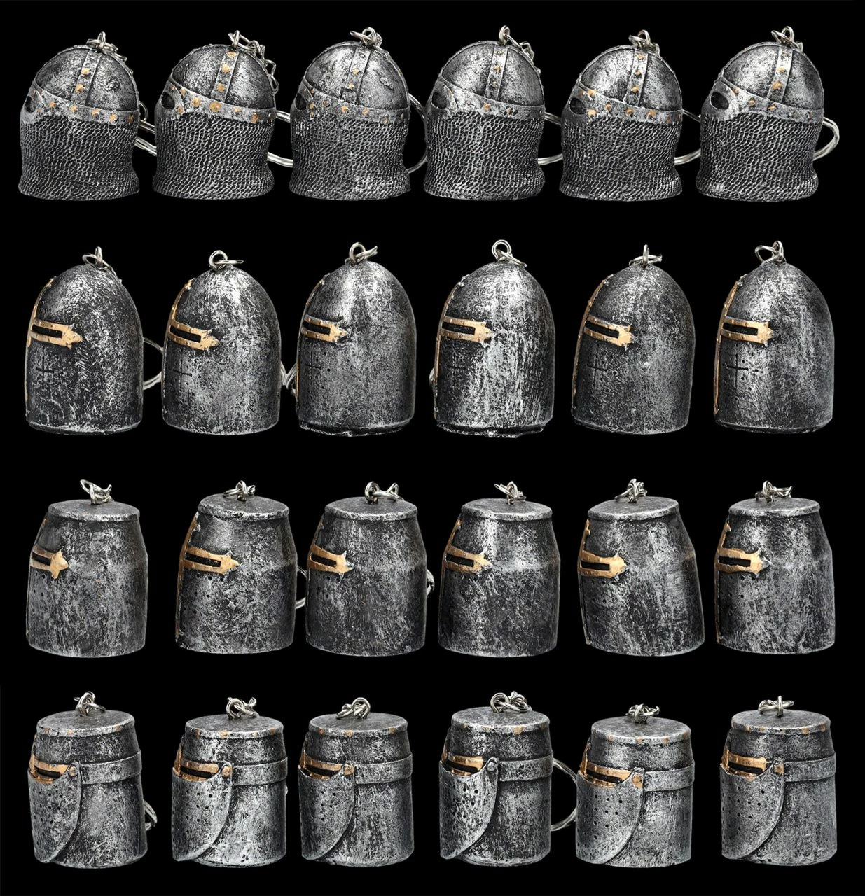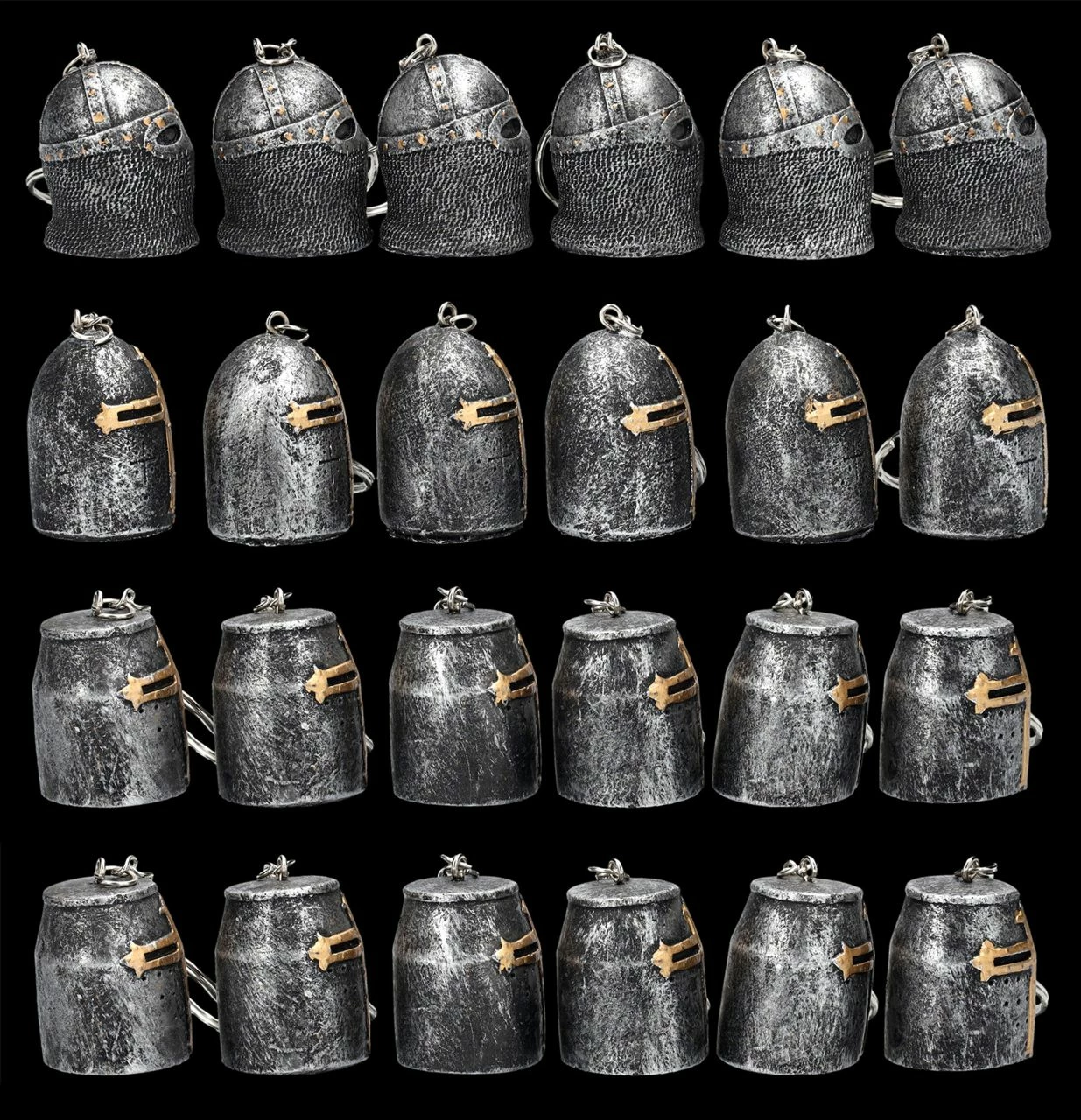Vier mal sechs unterschiedliche Ritterhelme enthält dieses fantastische Schlüsselanhänger-Set. Als Präsent für ein Ritter-Treffen oder ein toller Preis für ein Ritterturnier sind diese fantastischen Helme als Schlüsselanhänger perfekt geeignet. Sie sind aus Kunststein (Polyresin) gefertigt und metallfarben mit zum Teil goldenen Akzenten handbemalt. Die tollen Schlüsselanhänger sind je 4 cm hoch (die Gesamthöhe mit Anhänger ist 9,5 cm), je 2,5 cm breit und je 3 cm tief. Große und kleine Ritter werden sich über diese fantastischen Schlüsselanhänger mit Helm als Geschenk sicherlich sehr freuen.