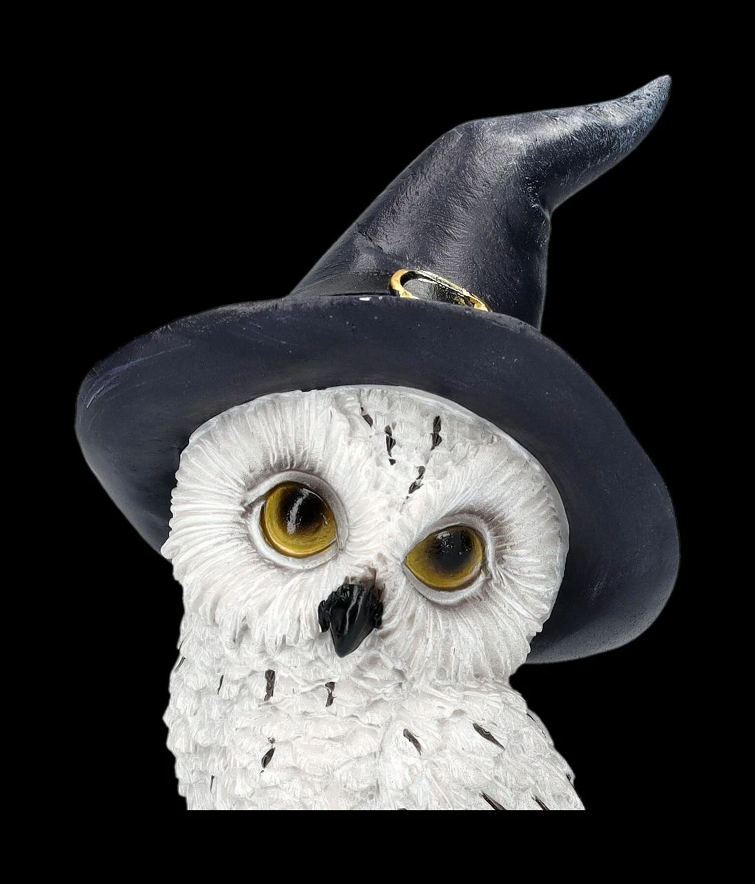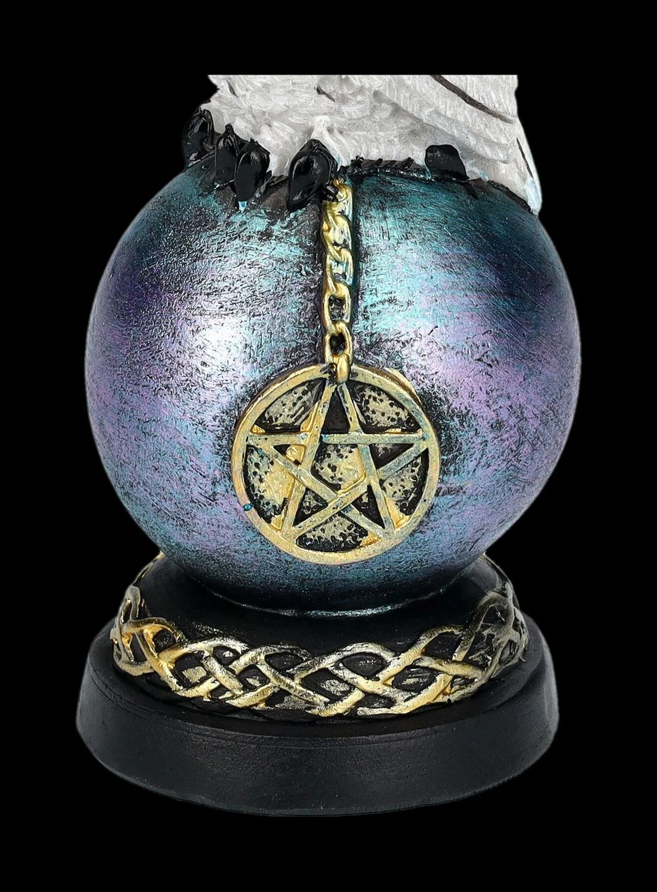 Mit treuherzig geneigtem Kopf und großen Augen blickt diese kleine Schneeeule mit dem Zauberhut nach rechts. Sie sitzt auf einer auf einem Sockel stehenden magischen Kugel und hält mit den Krallen ein Amulett mit einem Pentagramm fest. Die 20 cm hohe, 7 cm breite und 7 cm tiefe Schneeeulen-Figur wurde aus liebevoll handbemaltem Kunststein (Polyresin) gefertigt. Für Eulen-Fans ist sie – vielleicht auch gleich in Gesellschaft mit unserer nach links blickenden Schneeeule – ein fantastisches Geschenk.