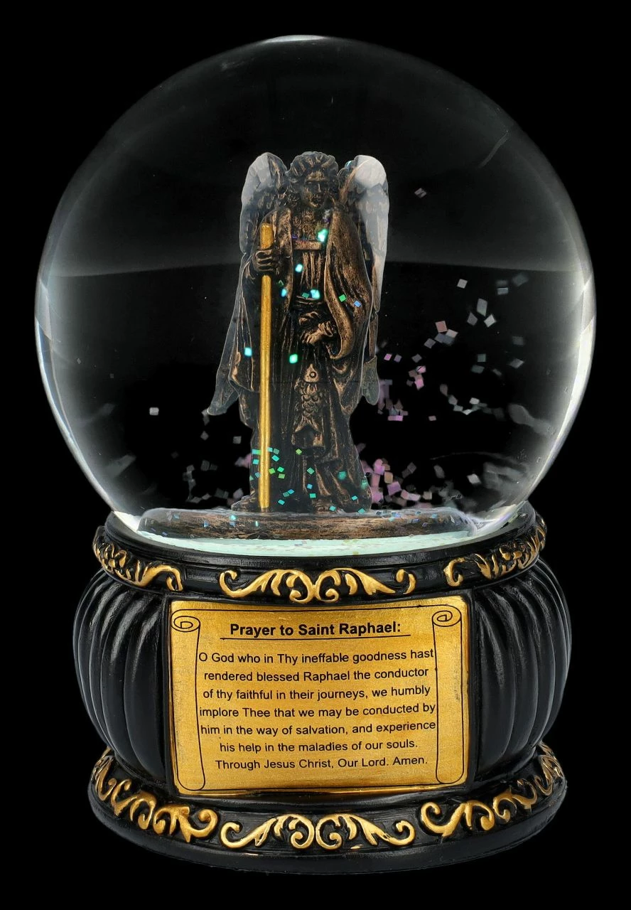 Diese wunderbare Schneekugel zeigt im Inneren der Glaskugel den Erzengel Raphael. Die Figur und die Halterung der Glaskugel sind aus handbemaltem Kunststein (Polyresin). Auf der Halterung ist ein englisches Gebet zu lesen. Übersetzt heißt das Gebet in etwa: ‚Gebet zum Heiligen Raphael. O Gott, der du in deiner unaussprechlichen Güte den gesegneten Raphael zum Wegbegleiter deiner Gläubigen auf ihren Reisen gemacht hast, wir flehen dich demütig an, dass er uns auf dem Weg der Erlösung führen möge und seine Hilfe in den Leiden unserer Seele erfahren möge. Durch Jesus Christus, unseren Herrn. Amen.‘ Die 14 cm hohe, 10 cm breite und 10 cm tiefe Schneekugel ist also ein perfektes Geschenk nicht nur für Sammler, sondern auch für alle Gläubigen.