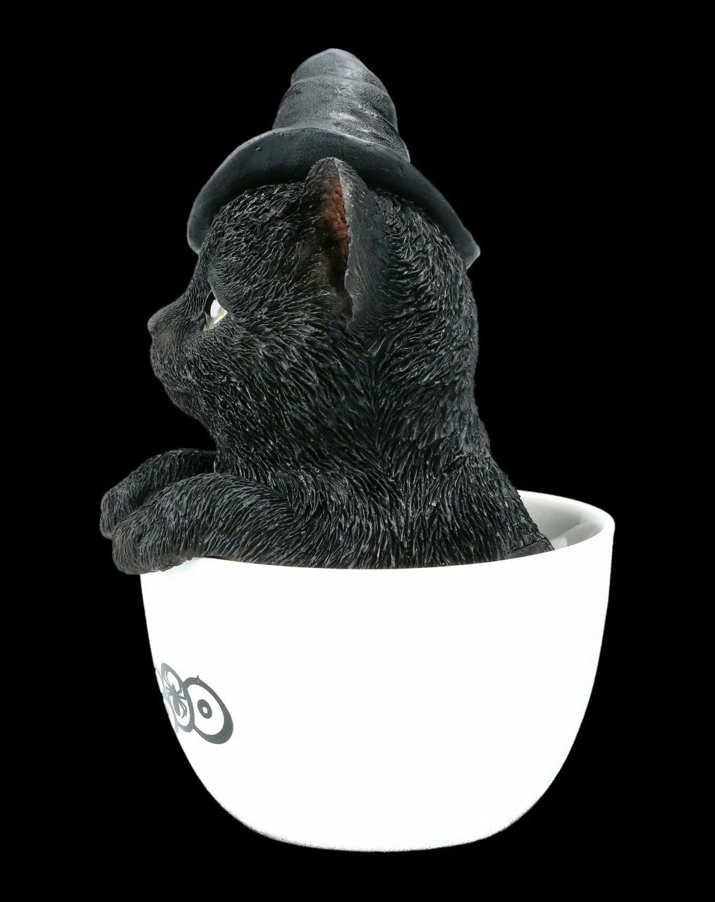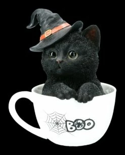 Schwarzer Kaffee hat jetzt in meiner Tasse keinen Platz mehr, denn da habe ich es mir schon bequem gemacht. Das scheint diese süße schwarze Hexen-Katze mit ihren glänzenden Augen und unschuldigem Blick zu sagen. Der Hexenhut zeigt auch, dass man gar nicht erst versuchen soll, Kaffee in diese Tasse zu gießen. Die lustige schwarze Hexen-Katze in der Tasse ist 16,0 cm hoch, 12,0 cm breit und 10,0 cm tief und aus handbemaltem Kunststein (Polyresin). Ein zauberhaftes Geschenk für Katzenfreunde.und das nicht nur zu Halloween.