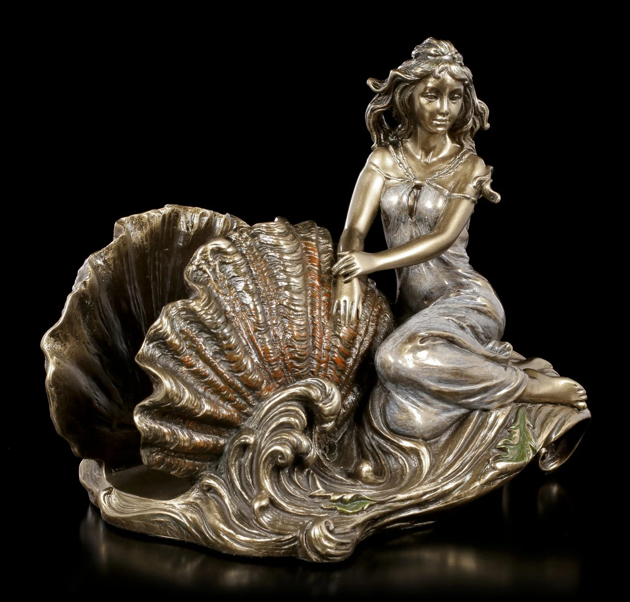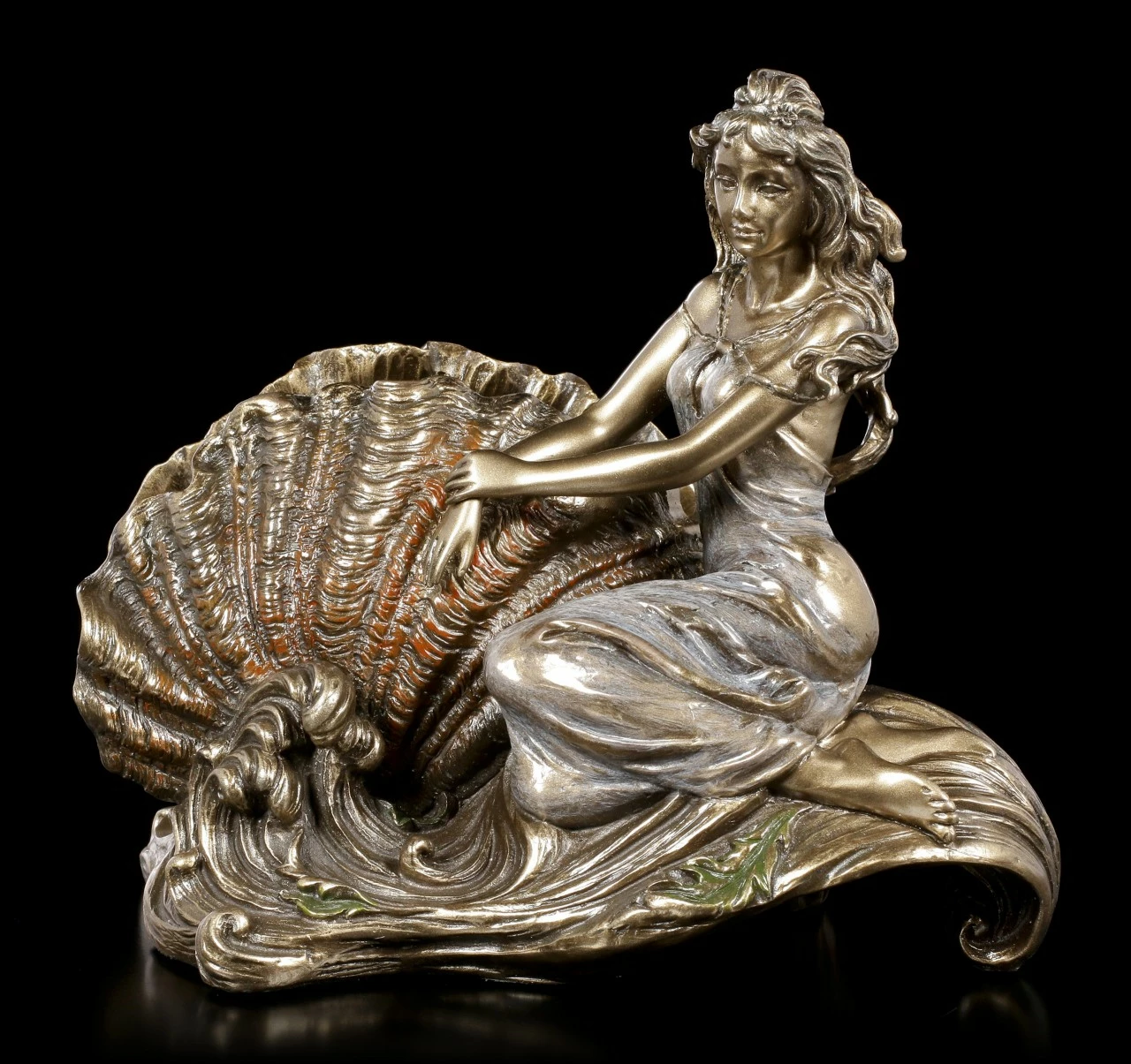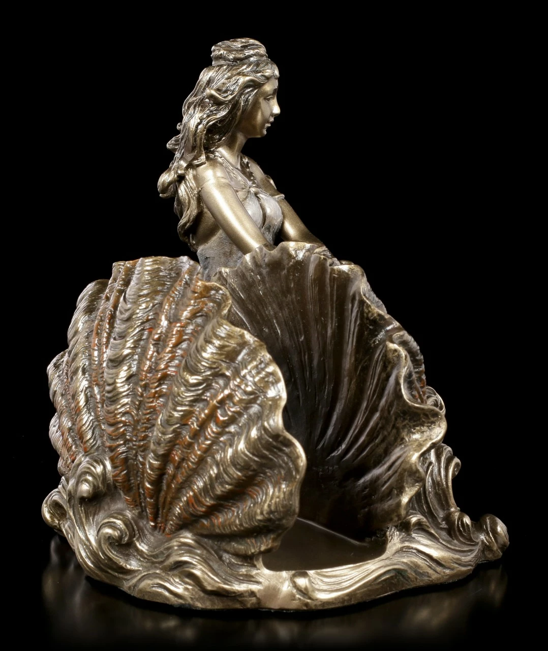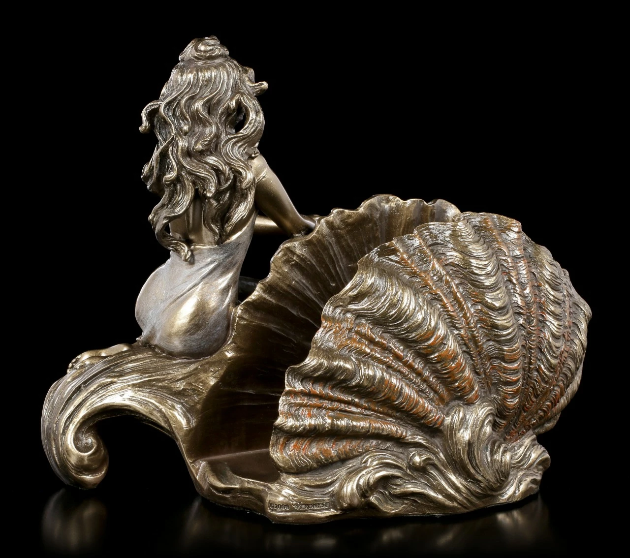 Die kleine Meerjungfrau sitzt neben einer leicht geöffneten Muschel und schaut den Fischen beim Schwimmen zu. Die detailreich gearbeitete Figur aus dem Hause Veronese ist aus bronziertem und coloriertem Kunststein (Polyresin) und gehört zur Art Nouveau Serie. Die halb geöffnete Muschel dient zugleich als Serviettenhalter, wenn Sie Ihren Tisch in einem maritimen Stil dekorieren wollen.