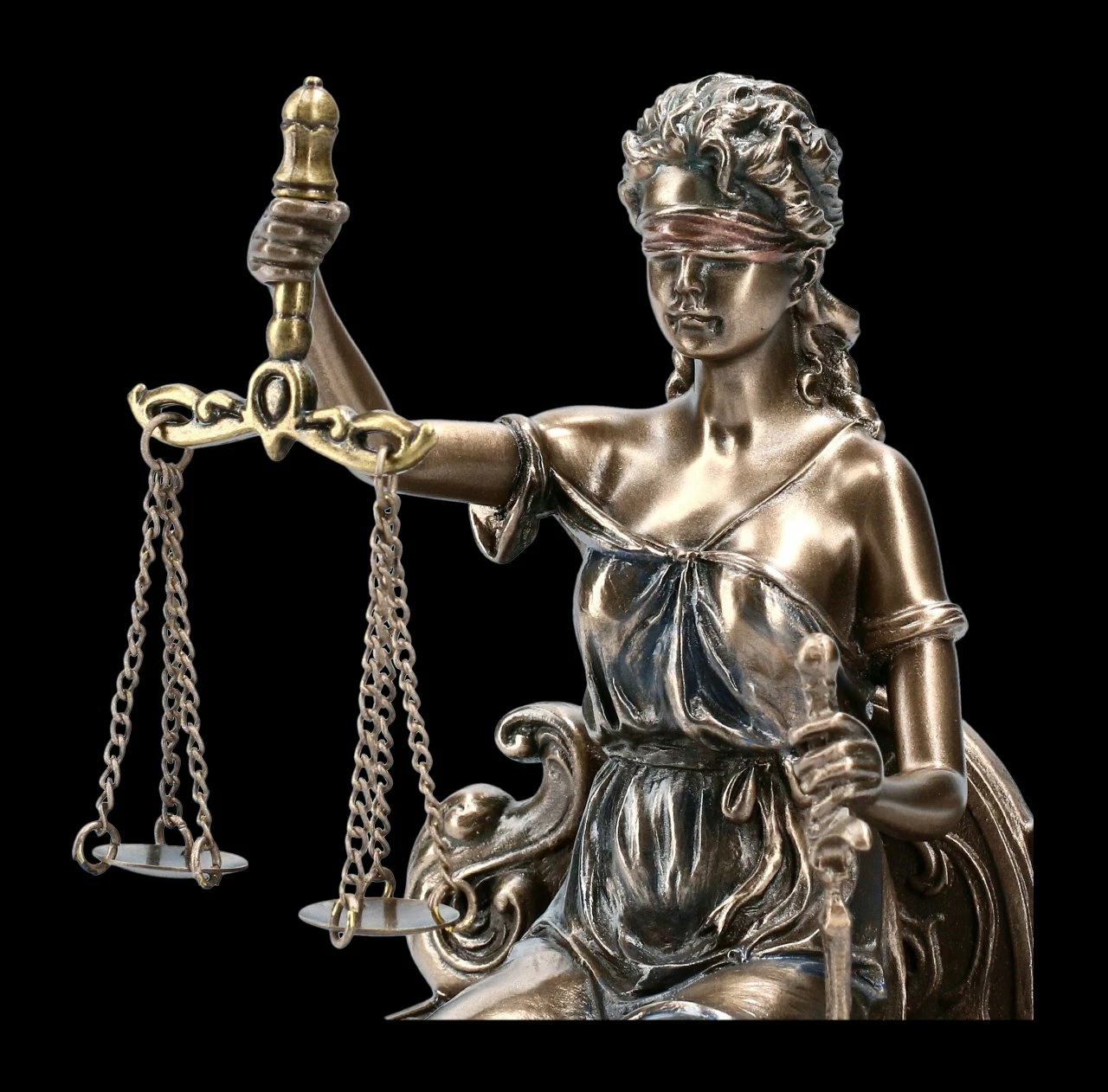 Römische Göttin der Gerechtigkeit. Im Griechischen genannt Dike. Darstellung mit Waage (Abwägen der Sachlage), dem Richtschwert (durchführen der Entscheidung) und der Augenbinde (Unvoreingenommenheit)