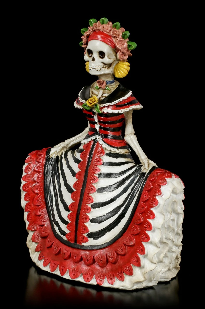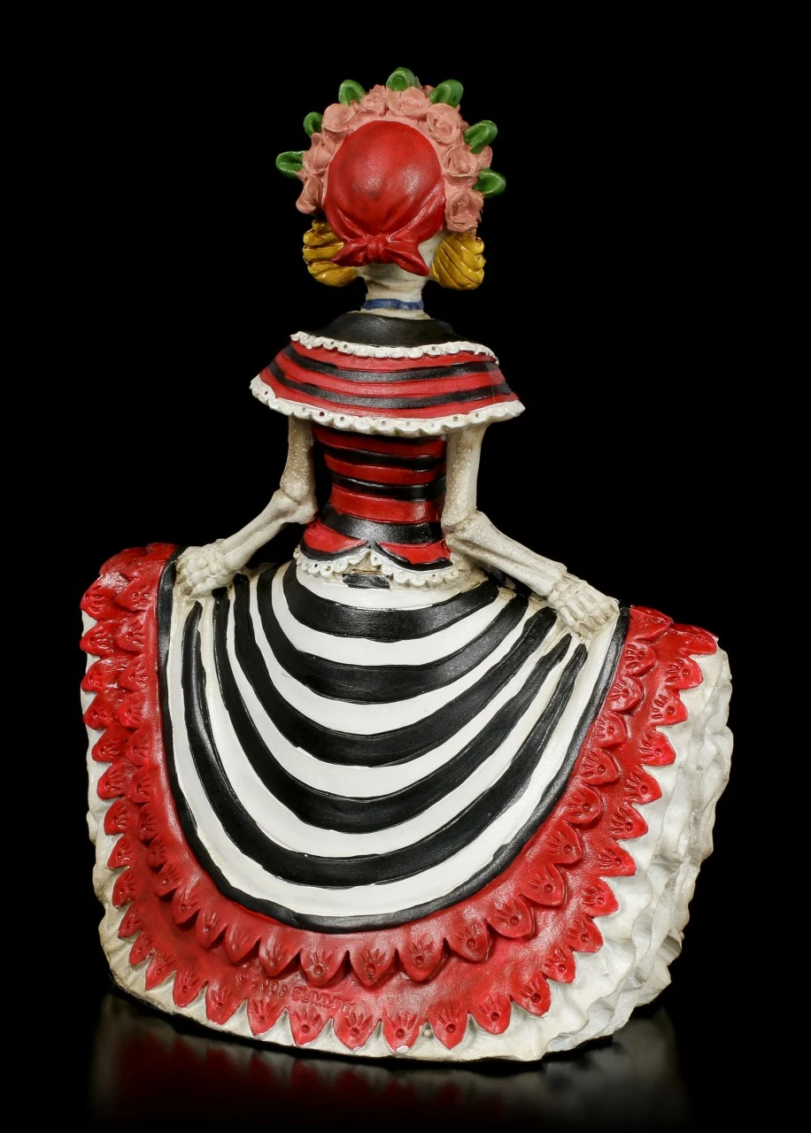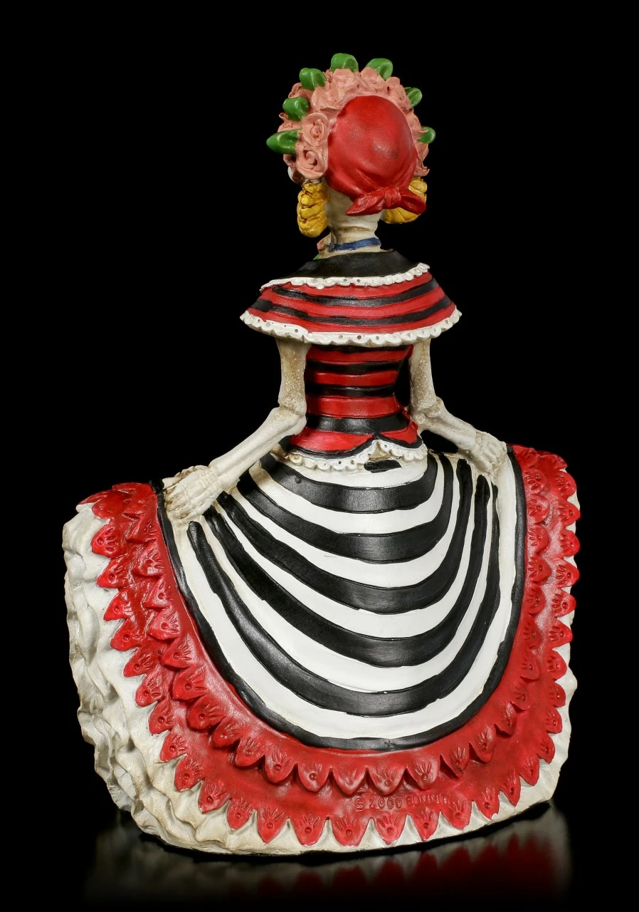 Anmutig und grazil tanzt die Senorita auf ihren Todestagsball. Diese wunderschöne Day of the Dead Skelett Figur wurde aus hochwertigem Kunststein (Polyresin) angefertigt und liebevoll handbemalt. Diese Figur wird Sie verzaubern.