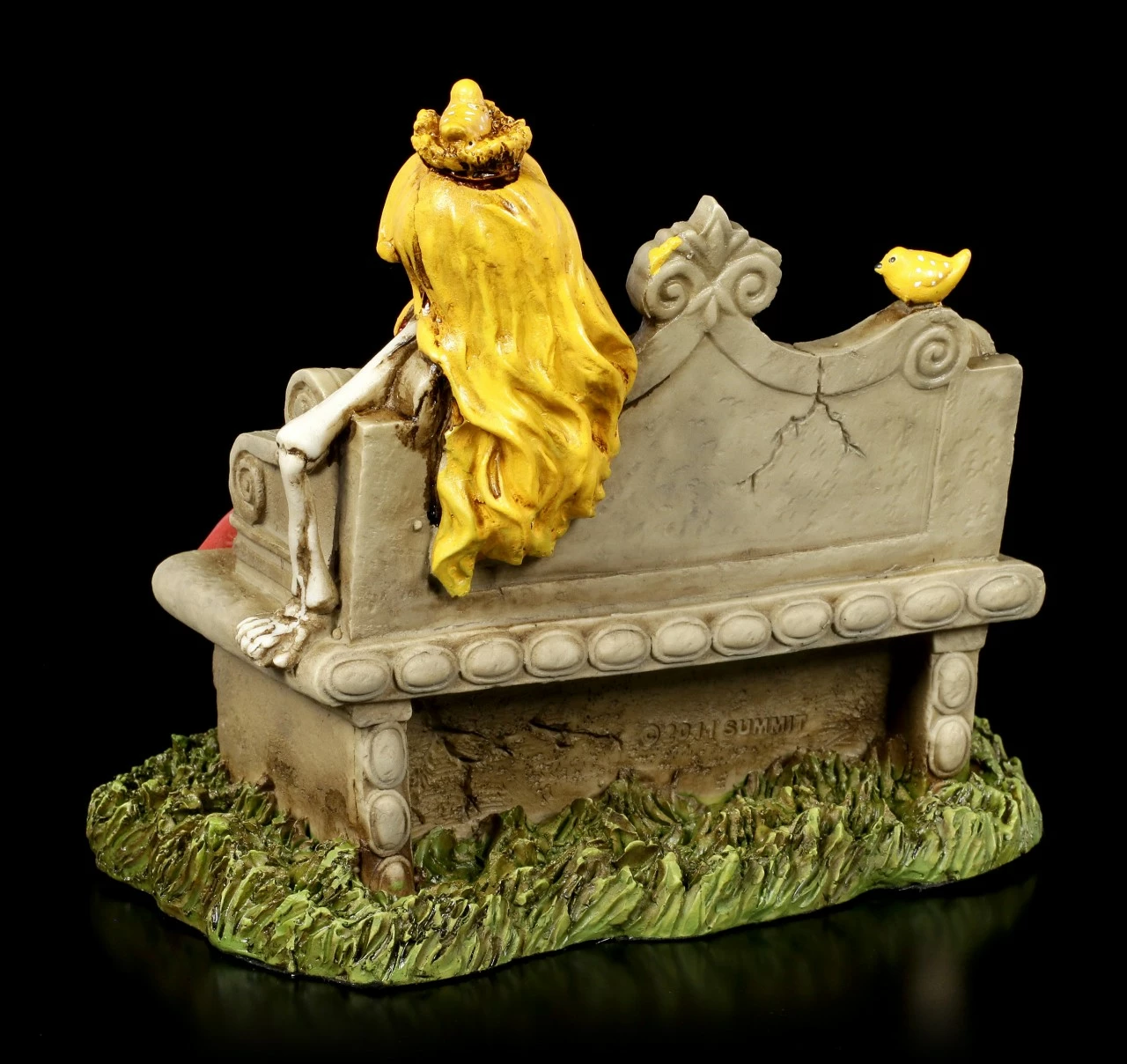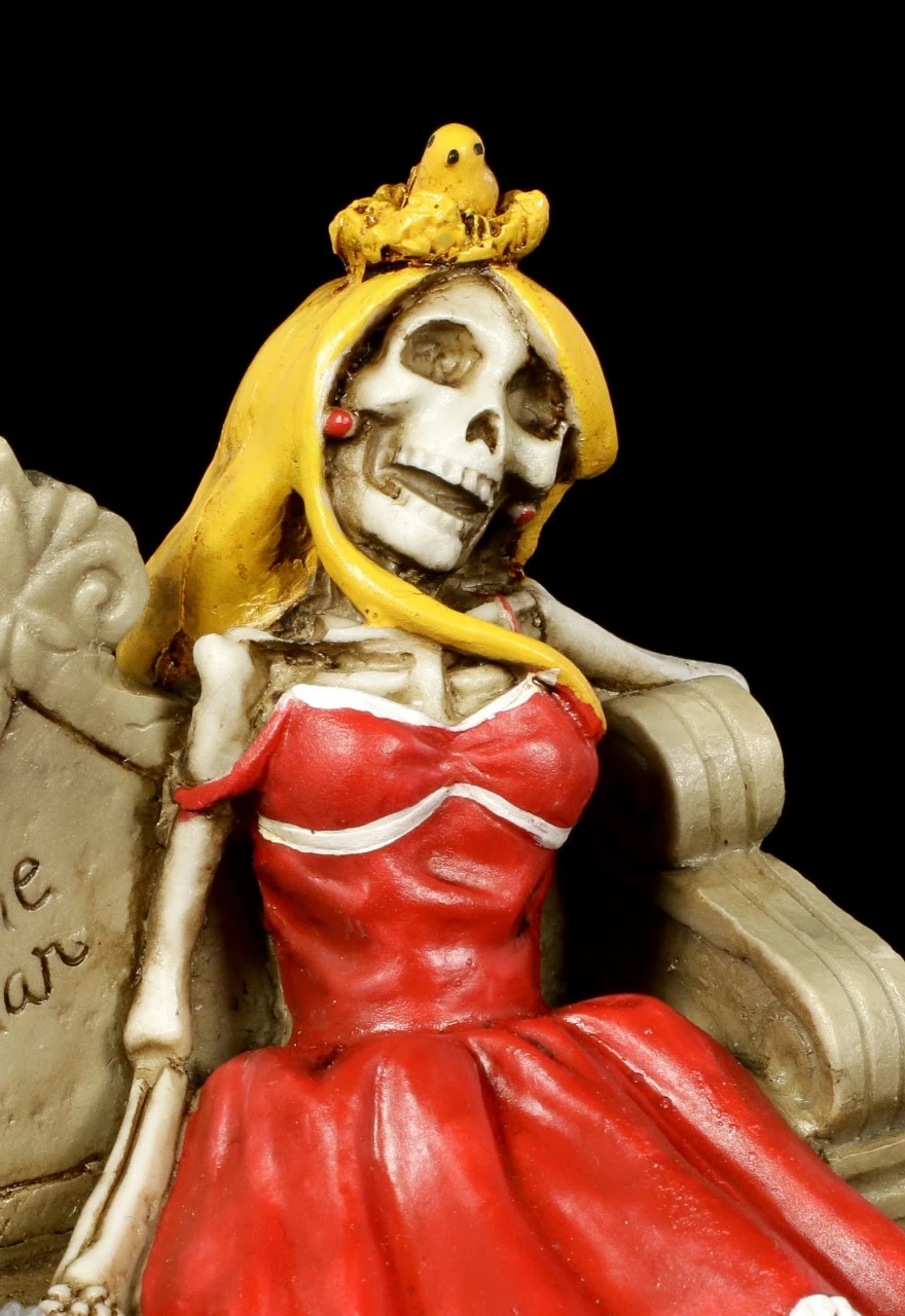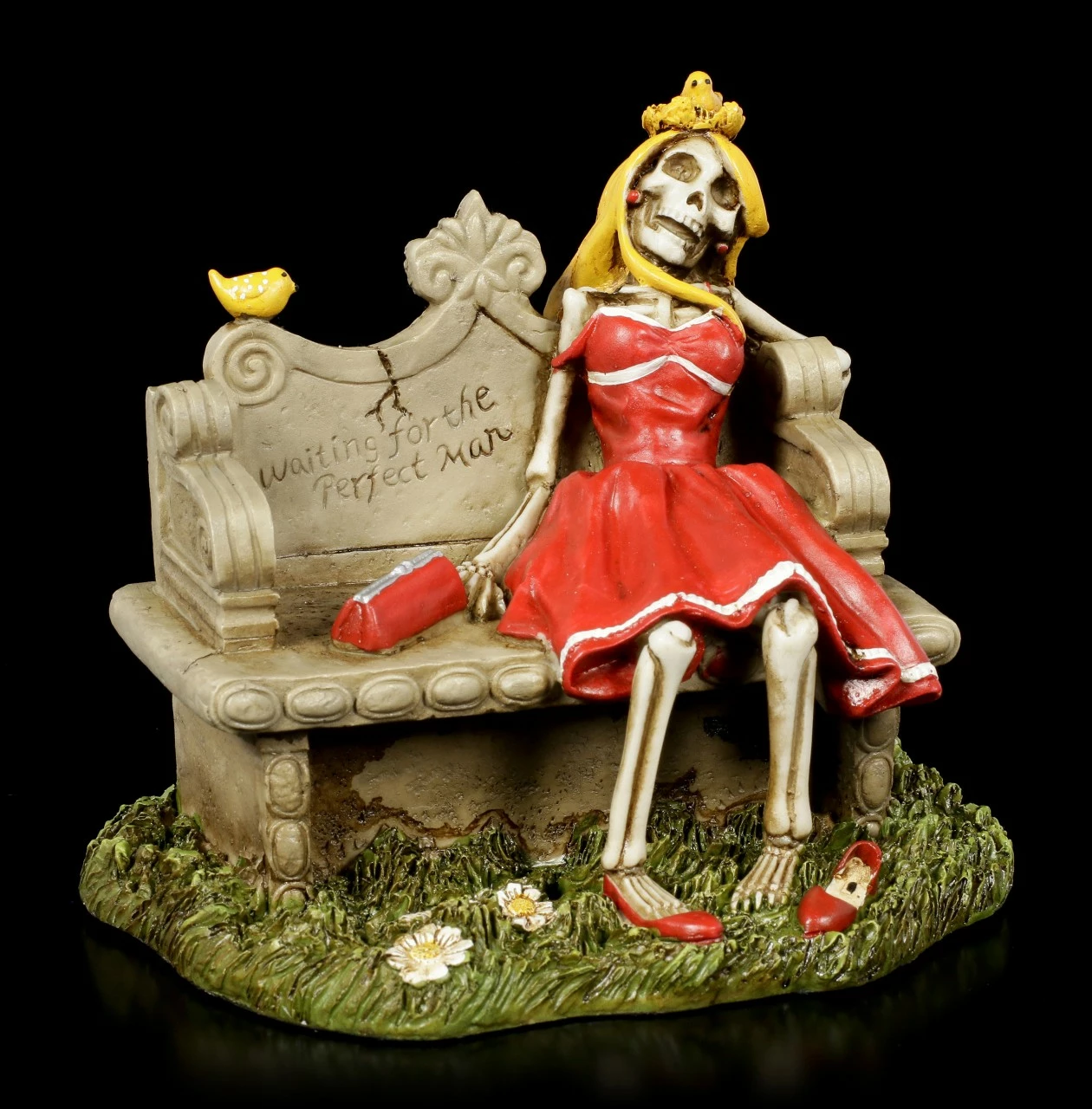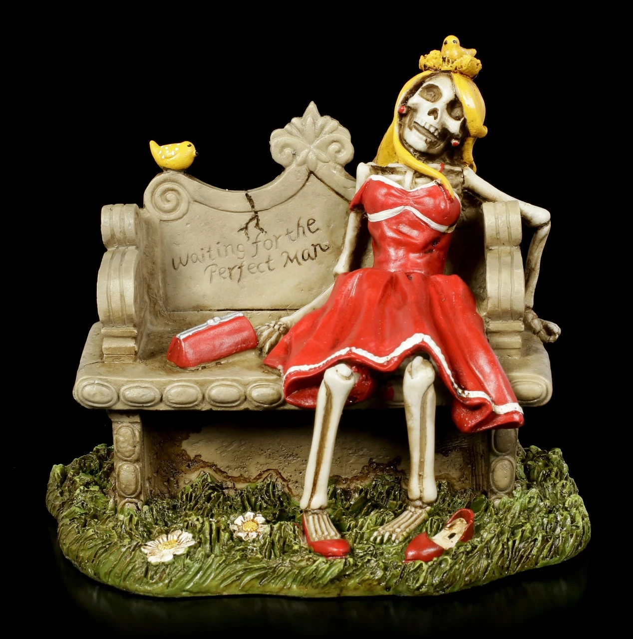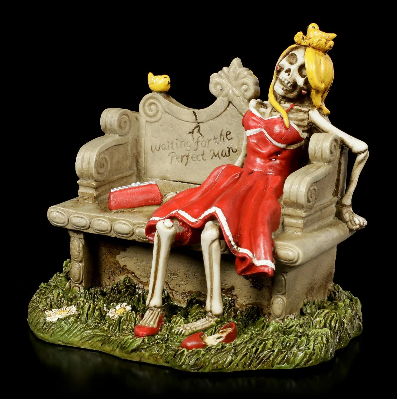 Tja, auch so kann Liebe aussehen, warten, warten warten…. Die junge hübsche Blondine hat wohl ein wenig zu lange gewartet. Die handbemalte Skelett Figur aus Kunststein (Polyresin) Waiting for the Perfect Man wird Sie begeistern. Es ist das perfekte Geschenk für einen Menschen, der Humor hat.