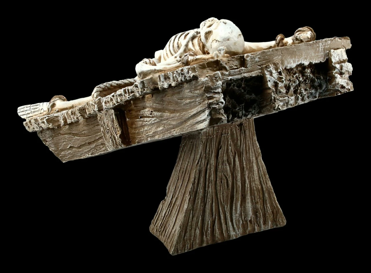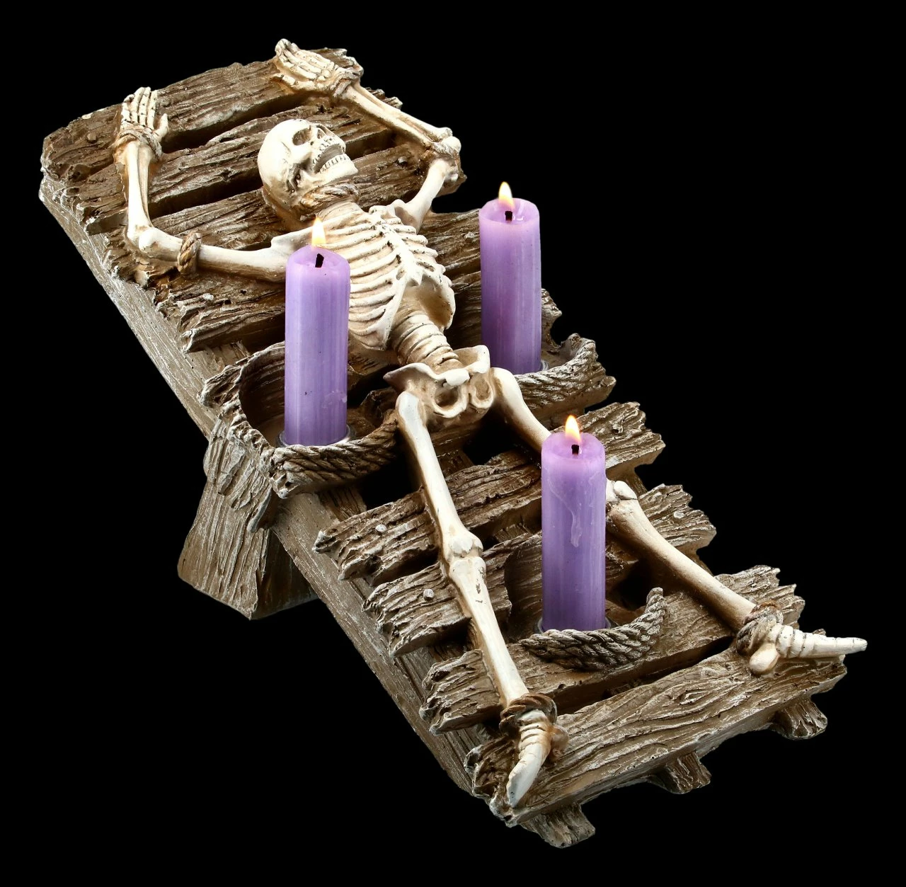 Was mag der arme Tropf wohl verbrochen haben, dass er auf der Streckbank festgebunden wurde? Ob es ein Ritual war? Denn der Platz für die 3 Kerzen lässt darauf schließen. Der außergewöhnliche, 18 cm hohe, 31 cm breite und 16,5 cm tiefe Kerzenhalter aus handbemaltem Kunststein (Polyresin) wird Sie begeistern.