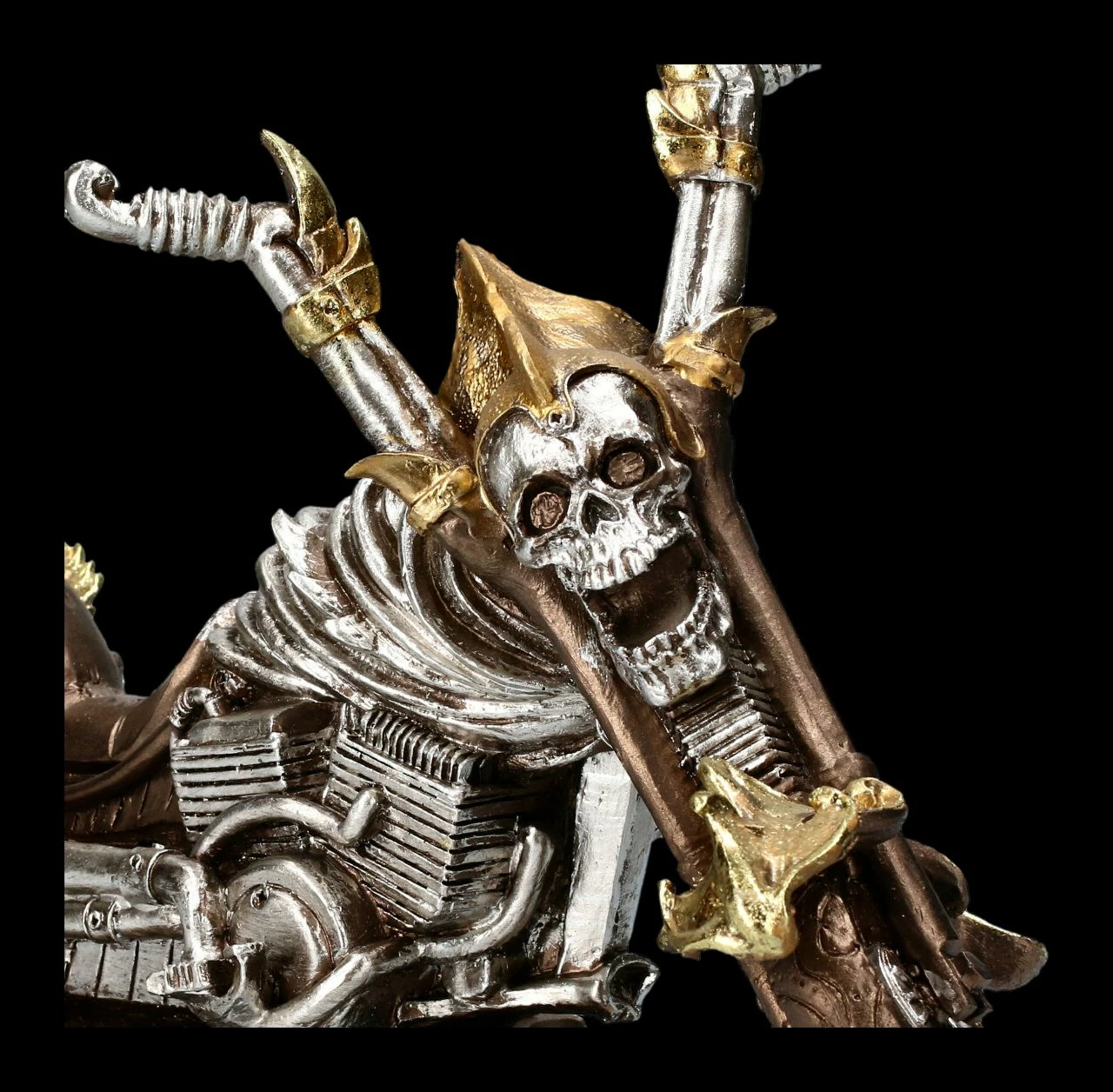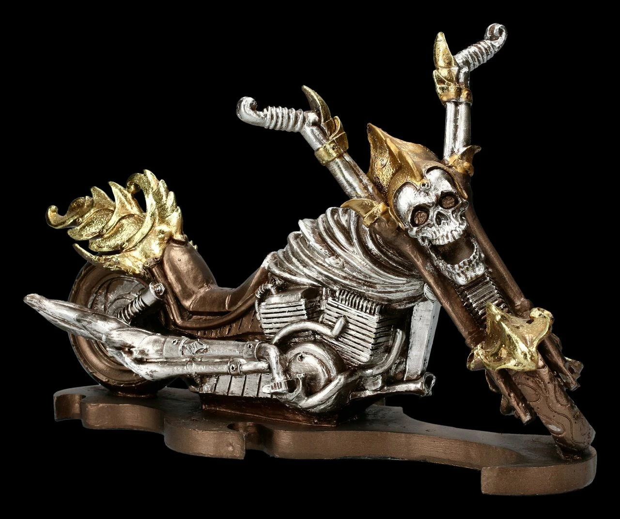 Dieses Skelett-Motorrad! WOW – wenn das Bike nicht cool ist. Auf der Straße wäre es der absolute Hammer, aber auch auf dem Schreibtisch oder im Regal ist das Skelett Motorrad mit Sicherheit DER Hingucker.und für jeden Biker ist die detailliert handbemalte, aus Kunststein (Polyresin) gefertigte Dekofigur Pedal to the Metal ein beeindruckendes Geschenk. Mit der Höhe von 20 cm, der Breite von 32 cm und der Tiefe von 12,5 cm passt das Bike auch super gut auf jede Werkstattbank.