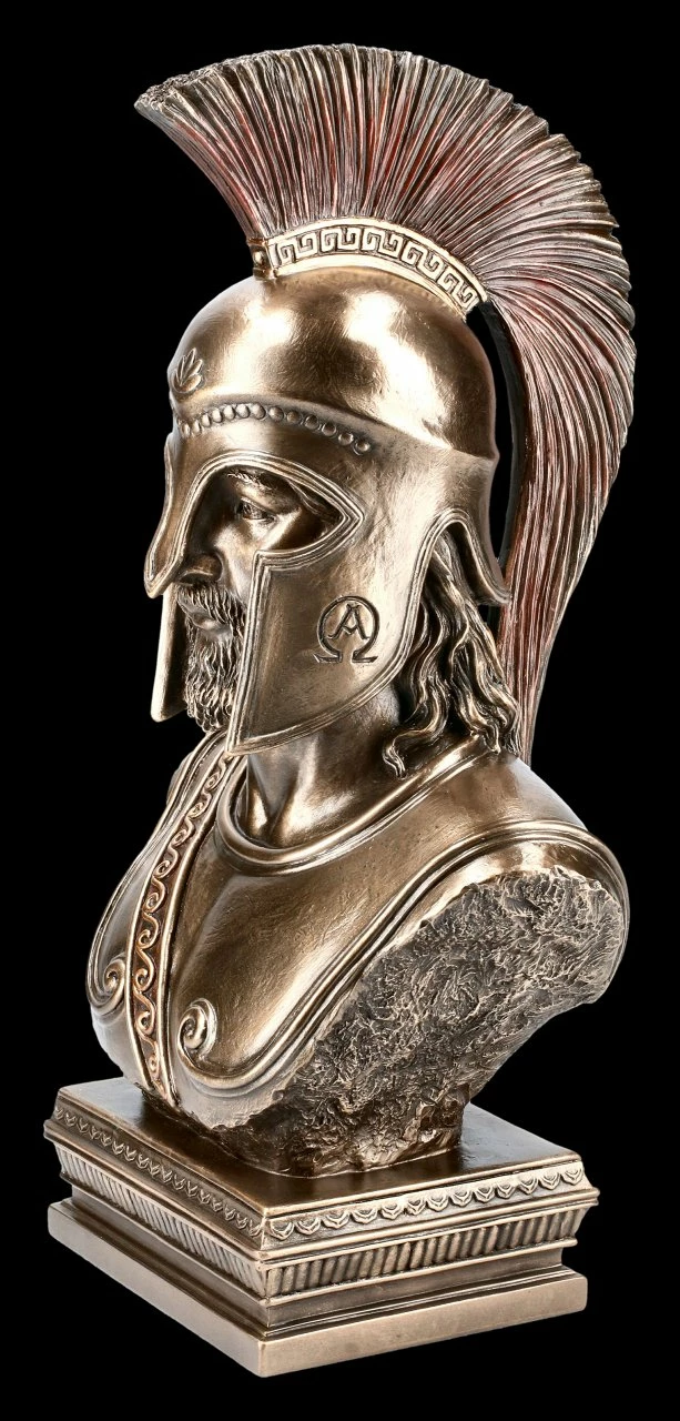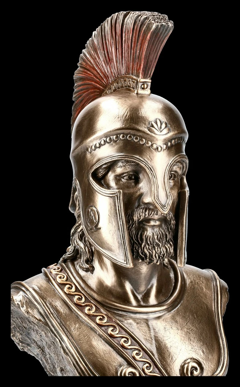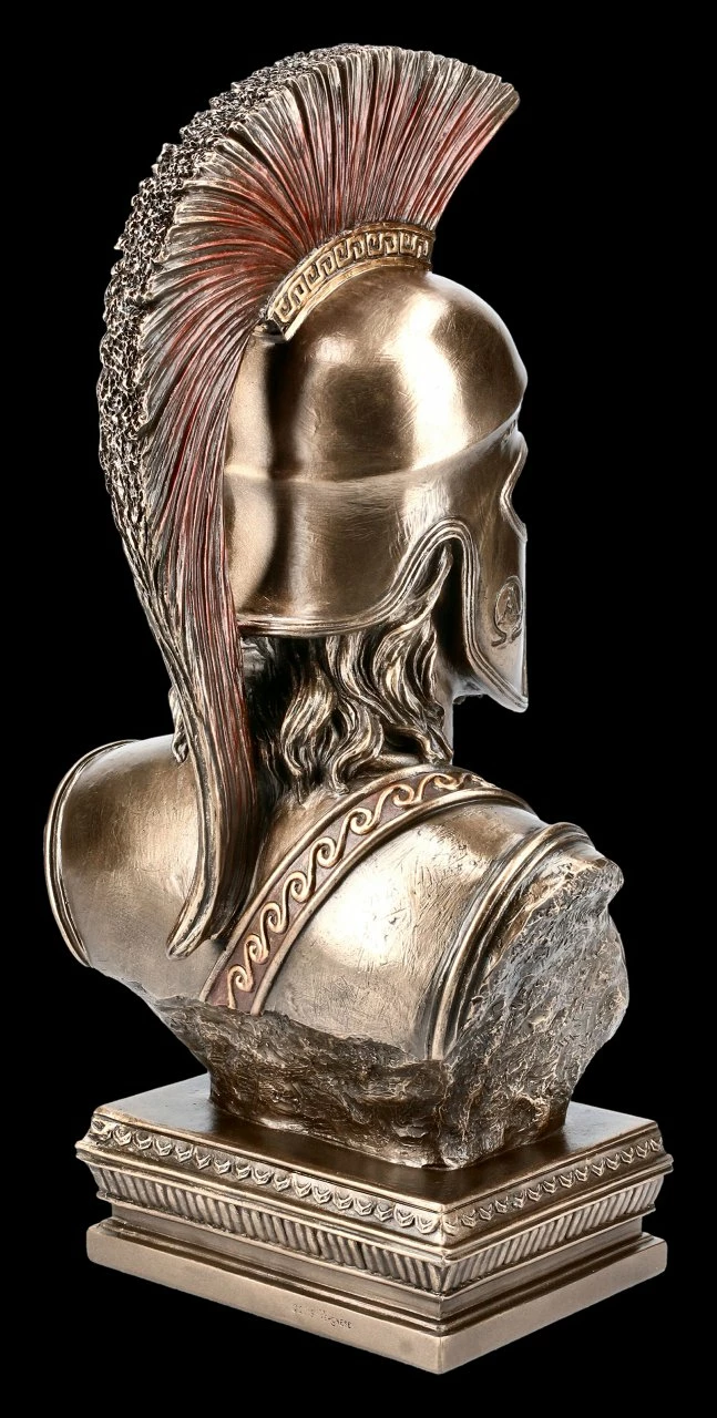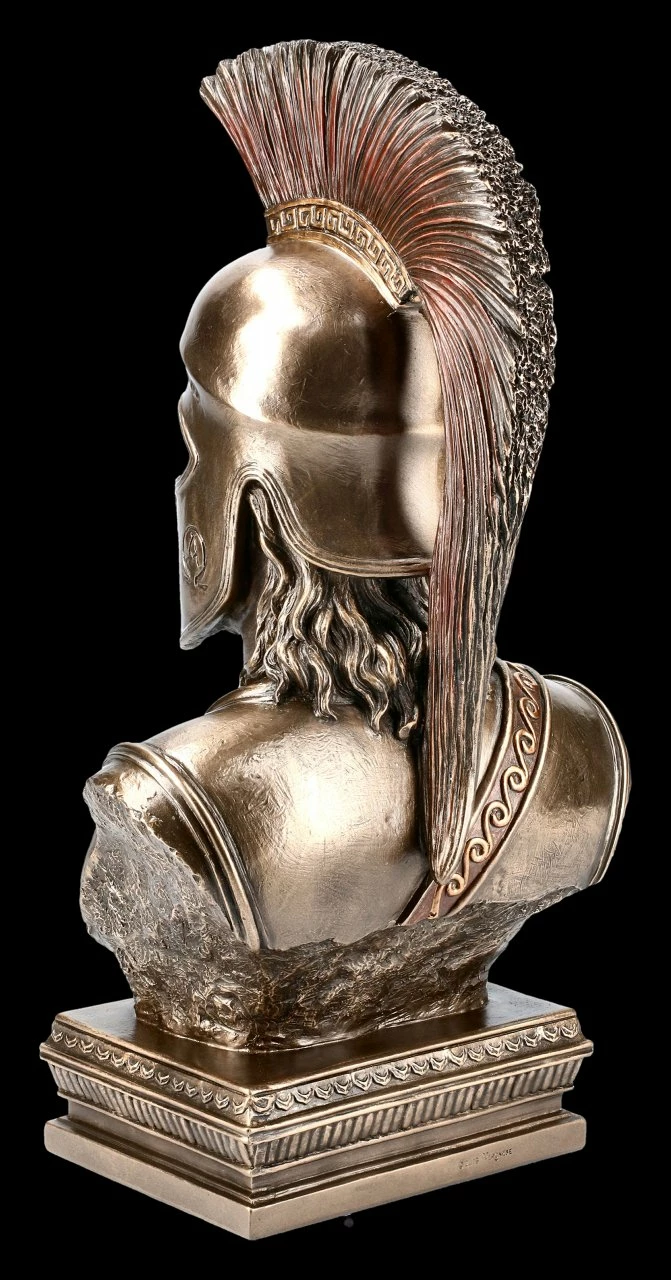 Zur Hoplitenrüstung der spartanischen Krieger gehörte ein aufwändig gearbeiteter Helm, der mit Pferdehaar geschmückt war. Diese Helme waren so konstruiert, dass sie den bestmöglichsten Schutz im Kampf bieten konnten. Diese umwerfende Büste eines Spartaners aus dem Haus Veronese gehört zur Studio Collection. Die aufwändig verzierte Büste ist aus edel bronziertem und zurückhaltend coloriertem Kunststein (Polyresin) gefertigt.
