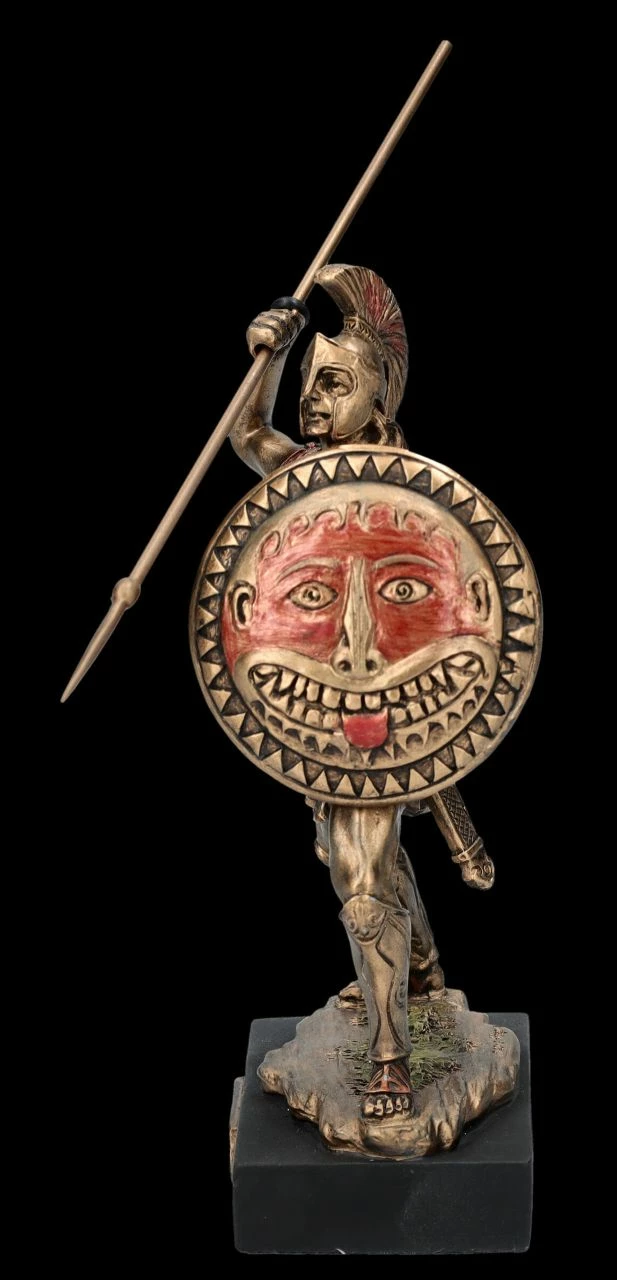 Wunderbar detailreich ist diese kleine bronzierte und fein colorierte Figur eines Spartanischen Krieges mit dem Speer, der zum Stecken ist. Der Krieger, der in kriegerischer Haltung auf einem mit ‚Spartan‘ beschrifteten Podest steht, trägt als Schutz ein altgriechisches Hopliten Gorgonen-Schild mit dem fratzenartigen Gesicht. Die fantastische spartanische Krieger-Figur aus hochwertigem Kunststein (Polyresin) stammt aus der Studio Collection von Veronese. Sie ist 14 cm hoch, 10 cm breit und 5,5 cm tief und ein tolles Sammler-Objekt. Für jeden, der sich für die Geschichte der alten Griechen interessiert, ist der spartanische Krieger ein perfektes Geschenk.