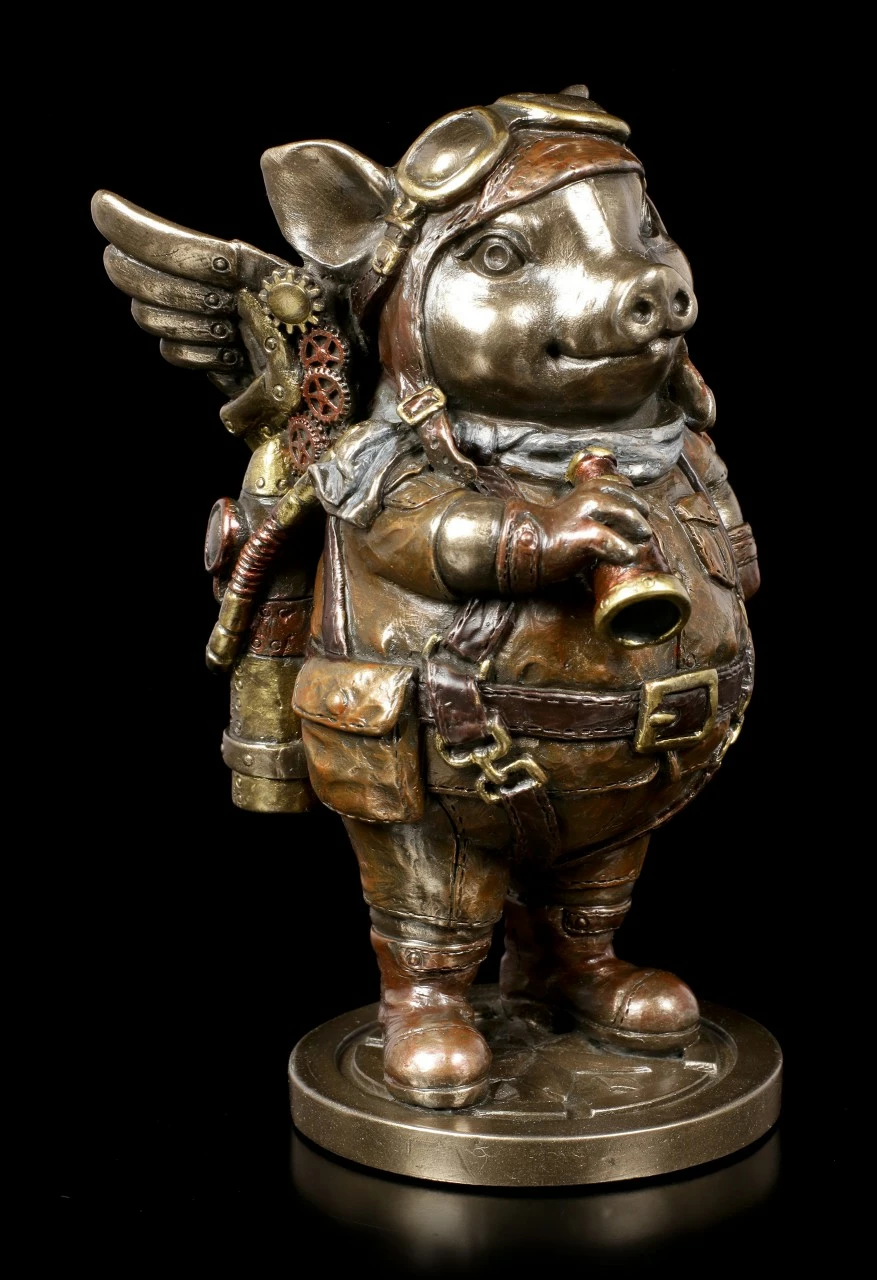 Pocus Machina ist wohl eine der ungewöhnlichsten Figuren von Veronese. Diese detailreiche Steampunk Schweine Figur aus der Serie Studio Collection besticht durch das außergewöhnliche Design und die vielen Details. Das als Flieger gekleidete Schwein aus fein bronziertem und coloriertem Kunststein (Polyresin) hat seine mechanischen Flügel umgeschnallt und mit seinem Fernrohr erkundet es die Umgebung. Ob es wohl bald abheben will?
