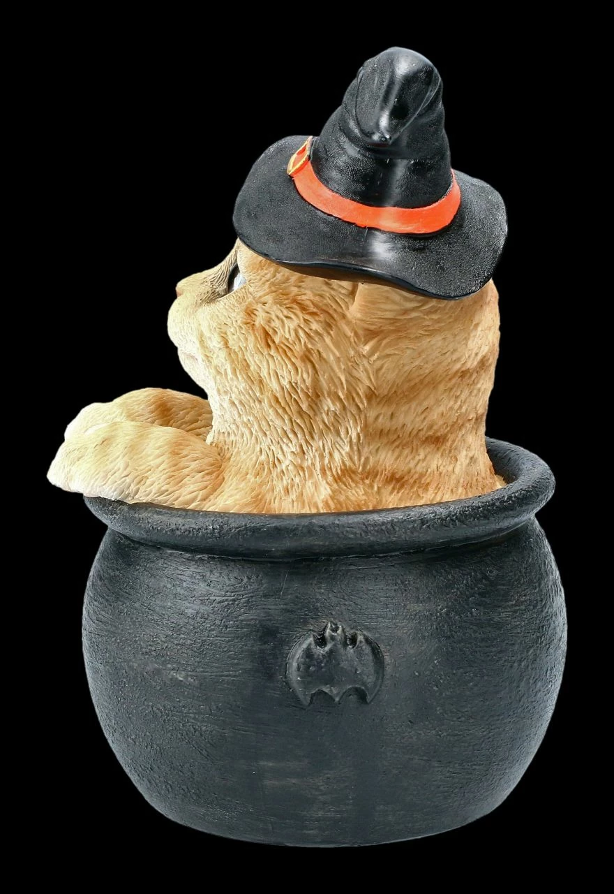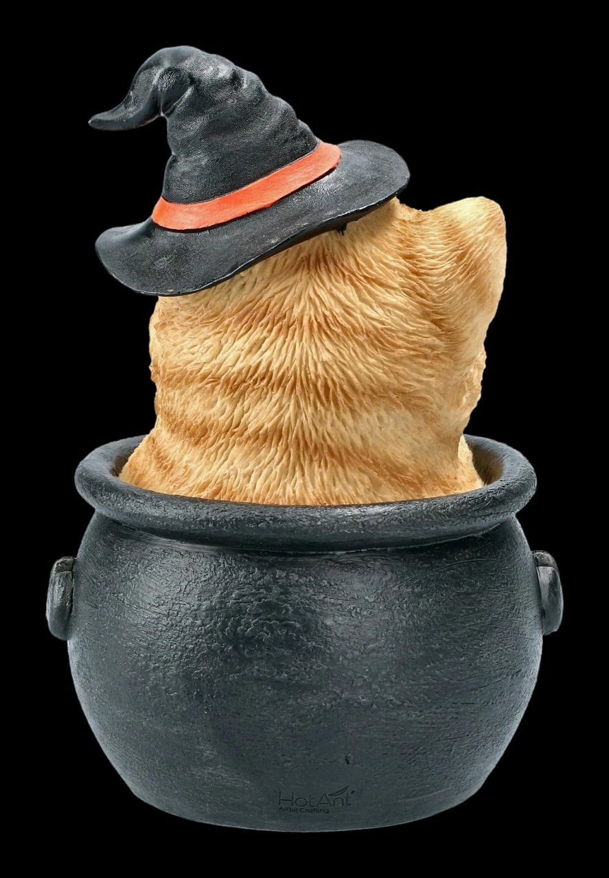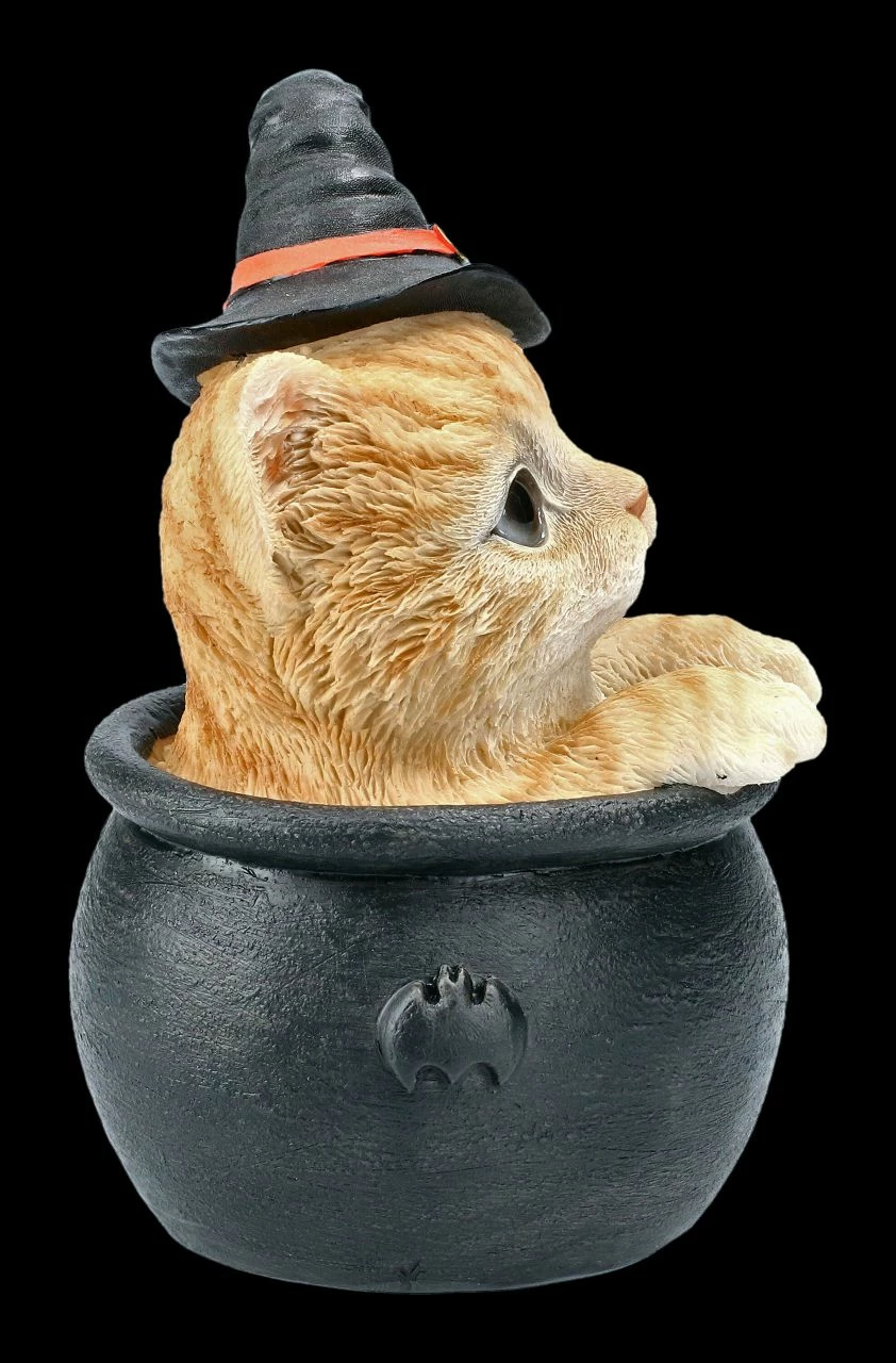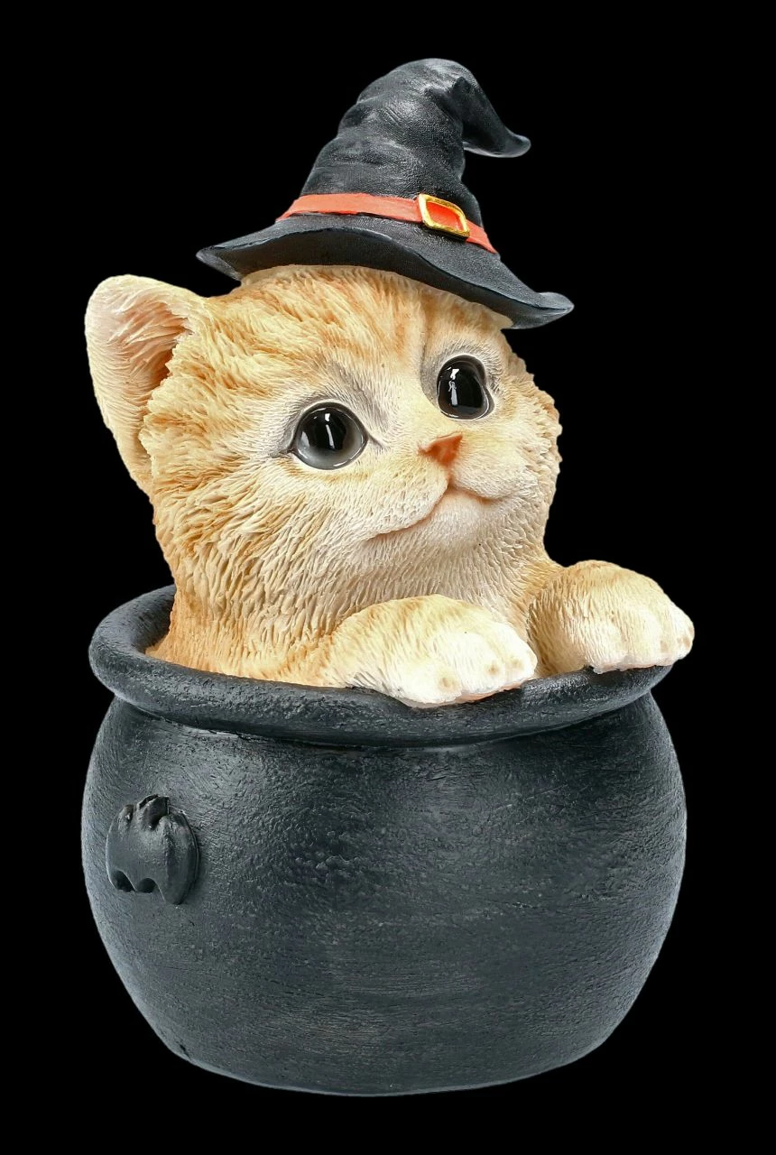 Sucht mich denn keiner, scheint sich dieses süße rote Tigerkatzenbaby zu fragen. Da war das Versteck im Hexenkessel wohl doch zu gut, oder macht mich vielleicht mein Hexenhut unsichtbar? Diese kleine süße Tabby Hexen-Katze ist mit dem Kessel 16,0 cm hoch, 11,0 cm breit und 10,0 cm tief und aus handbemaltem Kunststein (Polyresin). Das zauberhafte Kätzchen ist nicht nur zu Halloween ein tolles Geschenk für Katzenfreunde.