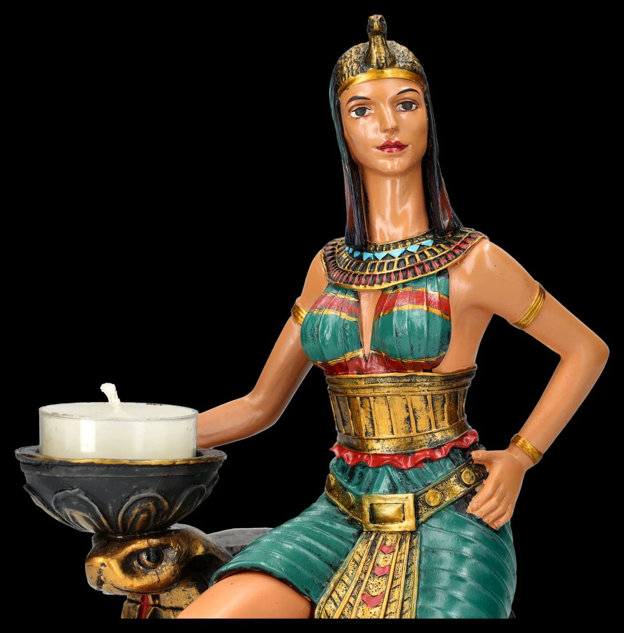 Stolz, selbstbewusst und angstfrei sitzt die Ägyptische Priesterin neben der goldenen Königskobra auf einem hohen Stein. Auf dem Kopf trägt die Kobra eine schöne Schale, in der ein Teelicht abgestellt werden kann. Der Teelichthalter mit der schönen Priesterin ist aus Kunststein (Polyresin) und wurde in schönen Farben mit goldenen Akzenten von Hand bemalt. Er ist 24,5 cm hoch, 12 cm breit und 8 cm tief und bringt altägyptisches Flair in jeden Wohnbereich. In der Schale hat ein Teelicht bis zu einem Durchmesser von 3,8 cm Platz. Das Teelicht ist in der Lieferung nicht enthalten. Die Ägyptische Priesterin mit der Kobra ist als Teelichthalter nicht nur sehr dekorativ, sie ist auch ein perfektes Geschenk für jeden, der sich für das Alte Ägypten interessiert.