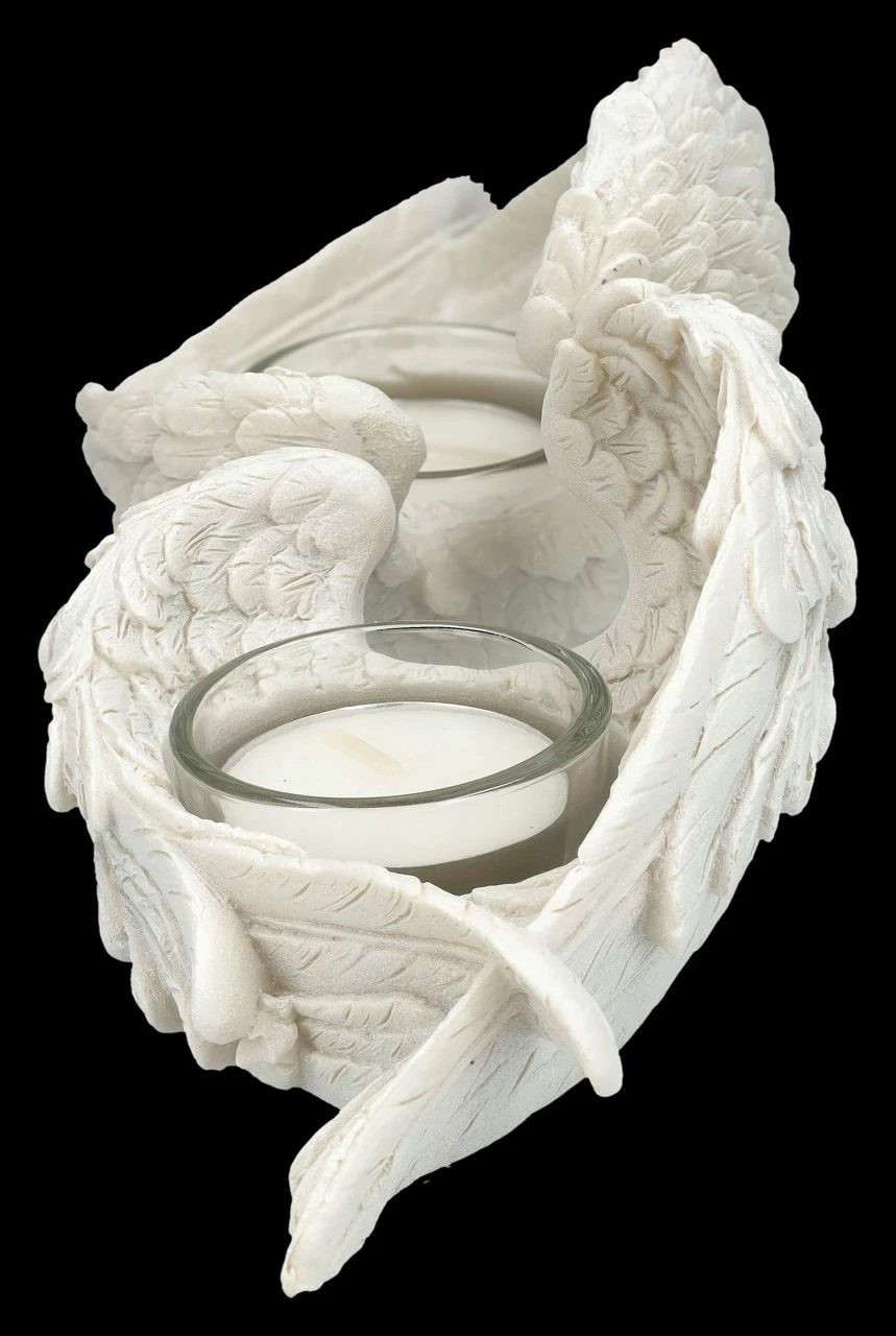 ‚Denkst du an Engel, so bewegen sie ihre Flügel‘, sagt der Volksmund. Nun, bewegen werden sich diese detailreichen Engelsflügel aus liebevoll handbemaltem Kunststein (Polyresin) zwar nicht, aber sie behüten die Flammen der Teelichter, die von den Flügeln gehalten werden. Die wunderbaren je 7,5 cm hohen, je 12 cm breiten und je 8,5 cm tiefen weißen Engelsflügel kommen im 2er Set. Sie sind ein schönes Geschenk, das man sich mit lieben Freunden teilen kann, sie sind aber auch für jeden Hochzeitstisch eine fantastische Deko. Die Lieferung erfolgt ohne Teelichter.