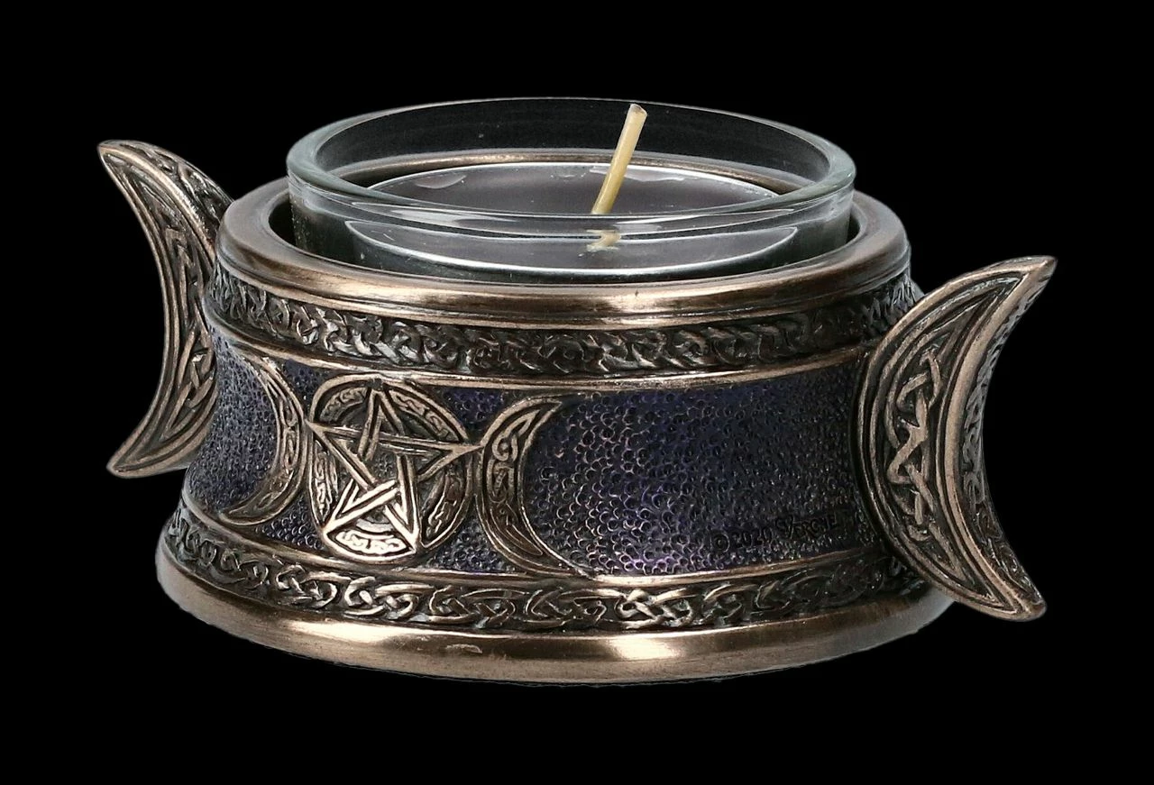 Der schön verzierte Teelichthalter aus der Studio Collection von Veronese spendet Ihnen perfekt das Licht für die magischen Momente der Entspannung nach einem langen Arbeitstag. Während die runde, mit dem Trinity Motiv verzierte Schale den Vollmond bildet, sind an den beiden Seiten des 4 cm hohen, 9 cm breiten und 7 cm tiefen Teelichthalters die beiden Mondsicheln angebracht. Der aus edel bronziertem und sehr fein coloriertem Kunststein (Polyresin) gefertigte Teelichthalter wiederholt am Rand der runden, mit keltischen Bordüren verzierten Schale das Motiv der Dreifach Göttin. Er bietet Platz für ein Teelicht mit den Maßen H: ca. 1,3 cm/ D: ca. 3,6 cm. Die Lieferung erfolgt ohne Teelicht.