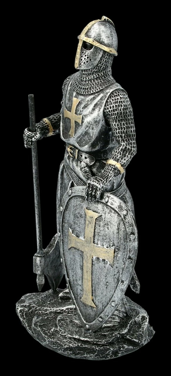 Sehr edel sieht dieser bewaffnete Tempelritter in seiner silbernen Rüstung mit dem goldenen Kreuz auf der Brust und auf dem Schild aus. Er ist von der Rüstung bis zur Kampfaxt und dem Schild sehr detailreich aus Kunststein (Polyresin) gefertigt und mit Sorgfalt handbemalt. Die fantastische Tempelritter Figur ist mit der Höhe von 18,5 cm, der Breite von 10 cm und der Tiefe von 7 cm eine tolle Figur für jeden Sammler und das perfekte Gechenk für Ritter.
