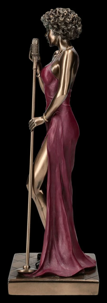 Beinahe kann man die Stimme einer der berühmten Jazz Sängerinnen, wie Ella Fitzgerald, Betty Carter, Carmen Mc Rae oder einer ihrer nicht minder berühmten Jazz-Schwestern hören, wenn man diese leidenschaftliche Sängerin von Veronese an ihrem Mikro betrachtet. Diese wunderbar elegante Jazz Band Figur aus der Studio Collection in ihrem sexy roten Kleid und den hochhackigen schwarzen Schuhen ist einfach perfekt dargestellt. Mit geschlossenen Augen lauscht sie den Tönen der Musik und gibt mit ihrer Stimme den Rhythmus vor. Die edel bronzierte, 30 cm hohe, 9,5 cm breite und 9,5 cm tiefe Jazz Band Figur der Sängerin wurde aus hochwertigem Kunststein (Polyresin) gefertigt und sorgsam mit viel Liebe zum Detail coloriert. Für begeisterte Fans berühmter Jazz Sängerinnen, aber auch für alle anderen Jazz Musiker ist diese wunderbare Sängerin das perfekte Geschenk. Mit den anderen Jazz Band Figuren aus unserem Shop, wie dem Saxophonisten und/oder dem Schlagzeuger, sind die Jazz-Band-Figuren von Veronese eine wunderbare Reminiszenz an die Großen des Jazz.