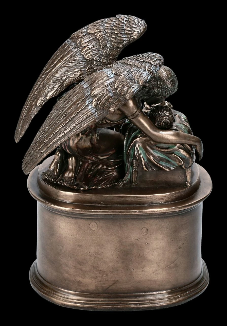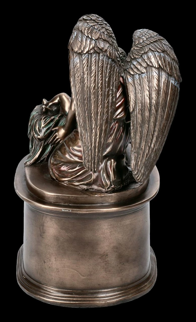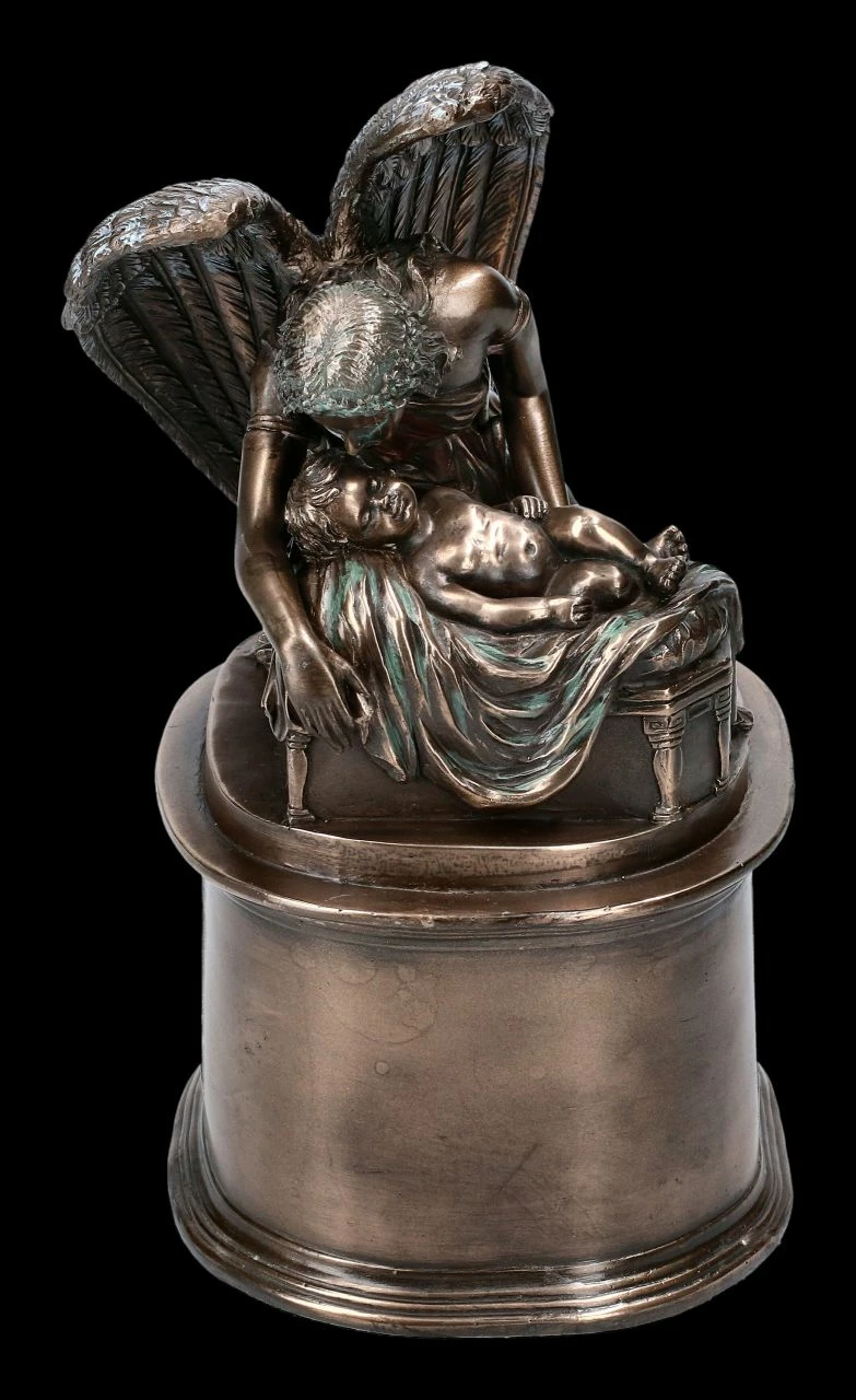 Ihr geliebter, treuer Begleiter hat Sie verlassen, aber gerade wenn die Trauer groß ist, helfen tröstende Gedanken. ‚Beschütze dieses Geschöpf, das von jemandem sehr geliebt wurde, auf seinem Weg in die Ewigkeit‘, scheint dieser wunderschöne Engel dem Jesuskind zuzuflüstern – und dieser Trost soll Sie begleiten! Die detailreich und sorgfältig aus handbemaltem Kunststein (Polyresin) gefertigte Tier Urne mit dem wunderschönen Engel und dem Jesuskind ist.mit der Höhe von 22 cm (Höhe Urne: 9 cm), der Breite von 15 cm und der Tiefe von 12 cm eine wunderbar tröstende Möglichkeit, stilvoll die Asche Ihres Lieblingstieres aufzunehmen. Die Urne hat ein Volumen von ca. 500 ml und Sie können mit ihr immer die Erinnerung an Ihr Lieblingstier vor sich sehen.