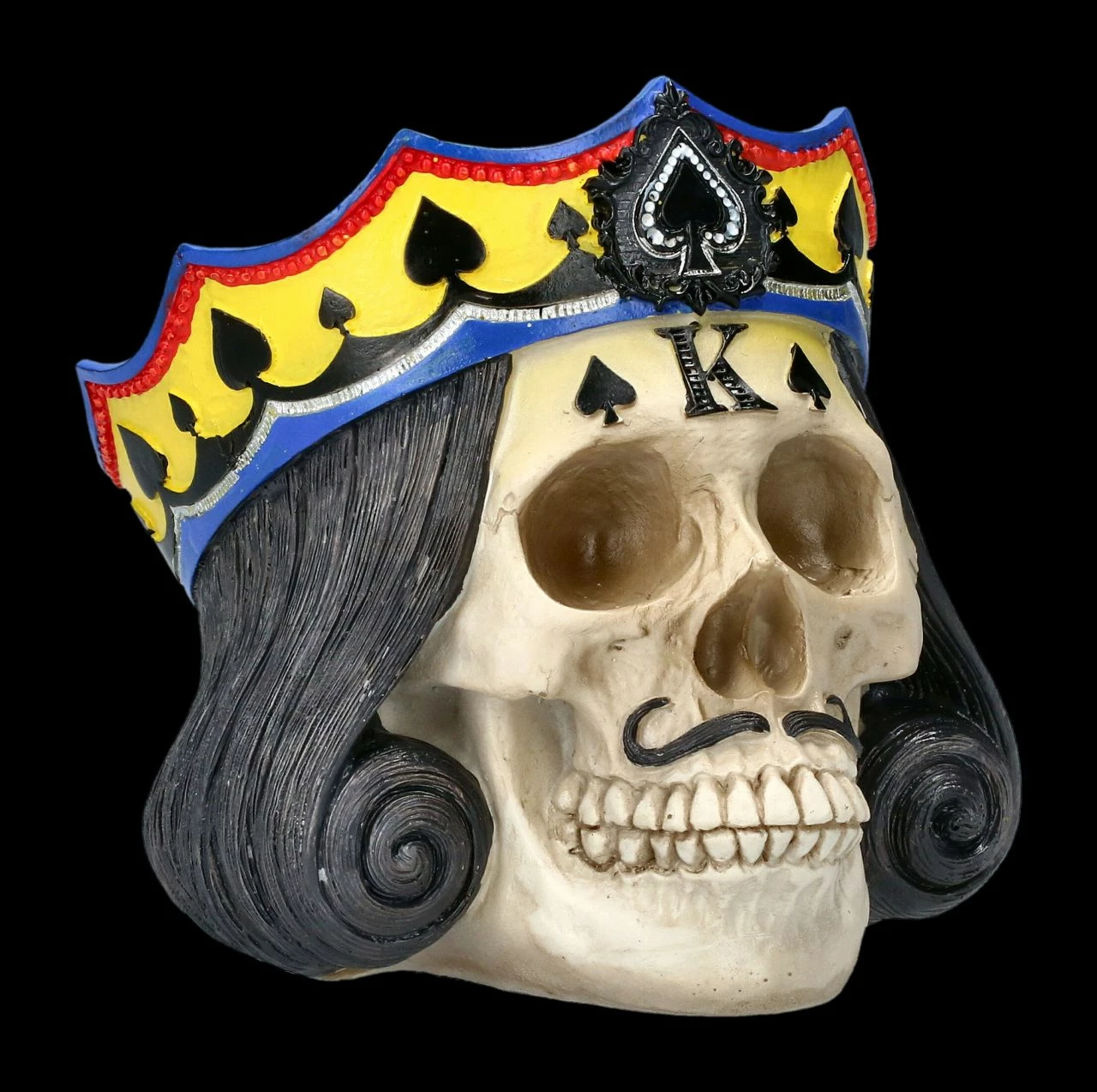 Vier freche Totenköpfe als Deko für Ihren nächsten Pokerabend – wie cool ist das denn! Das geniale 4-er Set ist aus lustig handbemaltem Kunststein (Polyresin) gefertigt. Die witzigen Poker Könige mit ihren Kronen sind je 12 cm hoch, 9,5 cm breit und je 11 cm tief. Um welchen König es sich handelt, ist ihm jeweils auf die Stirm geschrieben und auch auf der Krone zu entdecken. Besonders lustig ist vor allem der Herzkönig, dem auch noch ein Messer im Kopf steckt. Wäre doch interessant, wenn die vier Könige Ihre Pokerfreunde so verwirren, dass Sie jede Runde gewinnen.