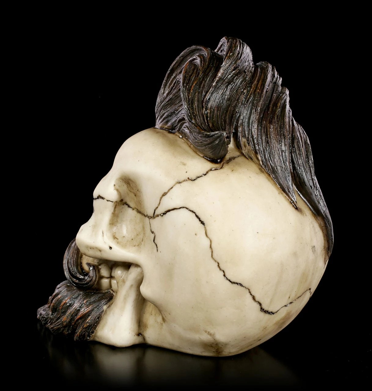 Der Totenschädel ist schon blank, nur sein Bart und seine Haartolle sind noch vorhanden. Der umwerfende handbemalte Schädel Bearded Buddy aus Kunststein (Polyresin) ist besonders auffällig und passt auch in einen trendigen Friseursalon.