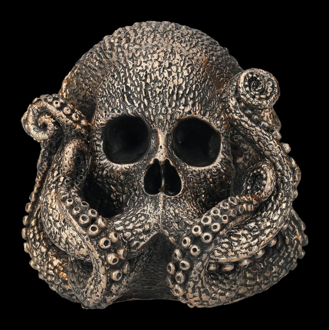 Zahlreiche Tentakel scheinen aus diesem Totenschädel zu wachsen. Fans von Lovecrafts Geschichte über das uralte Wesen Cthulhu, das vor Millionen von Jahren von den Sternen auf die Erde kam und in den Tiefen des Ozeans gefangen gehalten wird, werden von der Deko begeistert sein. Der 13 cm hohe, 14 cm breite und 15 cm tiefe Cthulhu Krakenschädel mit dem Gruseleffekt wurde detailreich aus Kunststein (Polyresin) gefertigt und wunderbar bronziert Für alle Cthulhu-Fans ist er ein cooles Geschenk.