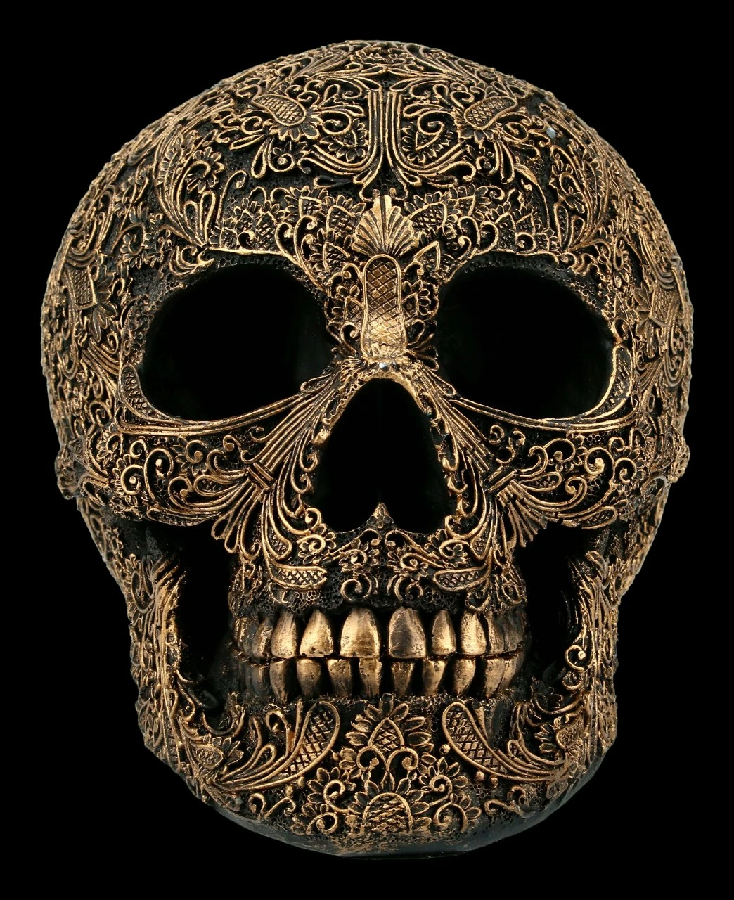 Sehr aufwendig mit feinen Ornamenten verziert, sieht dieser dekorative Deko Totenkopf wie ein außergewöhnlicher Schmuckgegenstand aus. Der Totenkopf ist sehr detailreich aus Kunststein (Polyresin) gefertigt und sorgfältig von Hand bemalt. Mit seiner Höhe von 13 cm, der Breite von 12 cm und der Tiefe von 17 cm ziert er jeden Schreibtisch oder jedes Regal und wird überall die Aufmerksamkeit Ihrer Besucher auf sich ziehen.