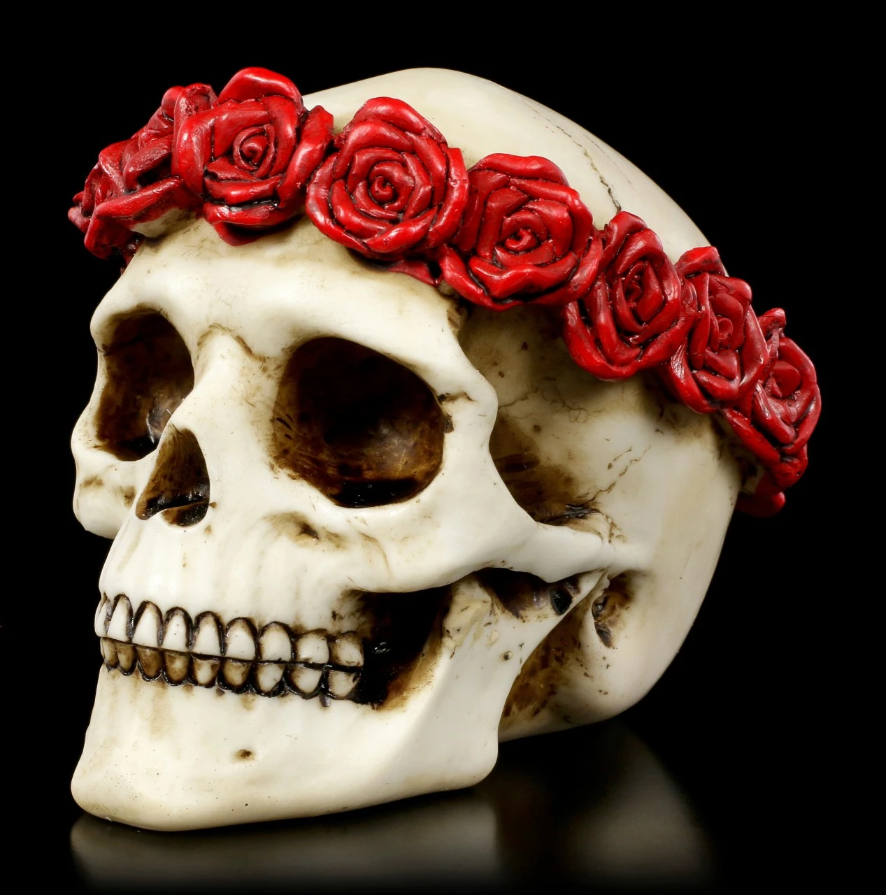 Den kleinen menschliche Schädel ziert eine Blumenkrone. Die roten Rosen stehen im wunderbaren Farbkontrast zu dem handbemaltem Totenkopf aus Kunststein (Polyresin) in knochenfarbenem Finish. Nicht nur für Gothic Fans ein tolles Geschenk.