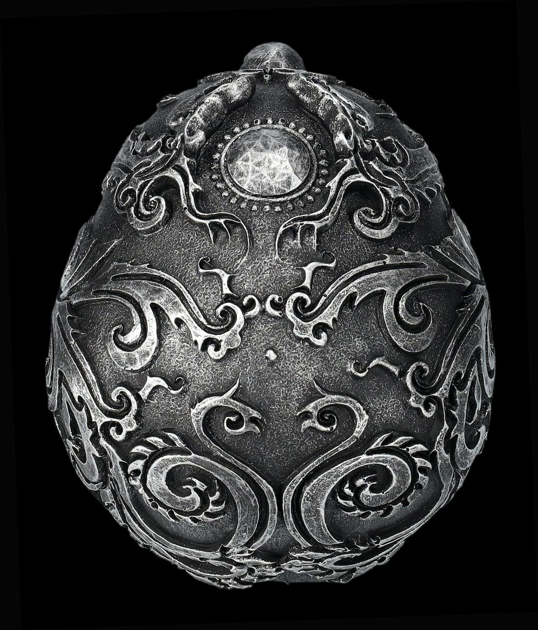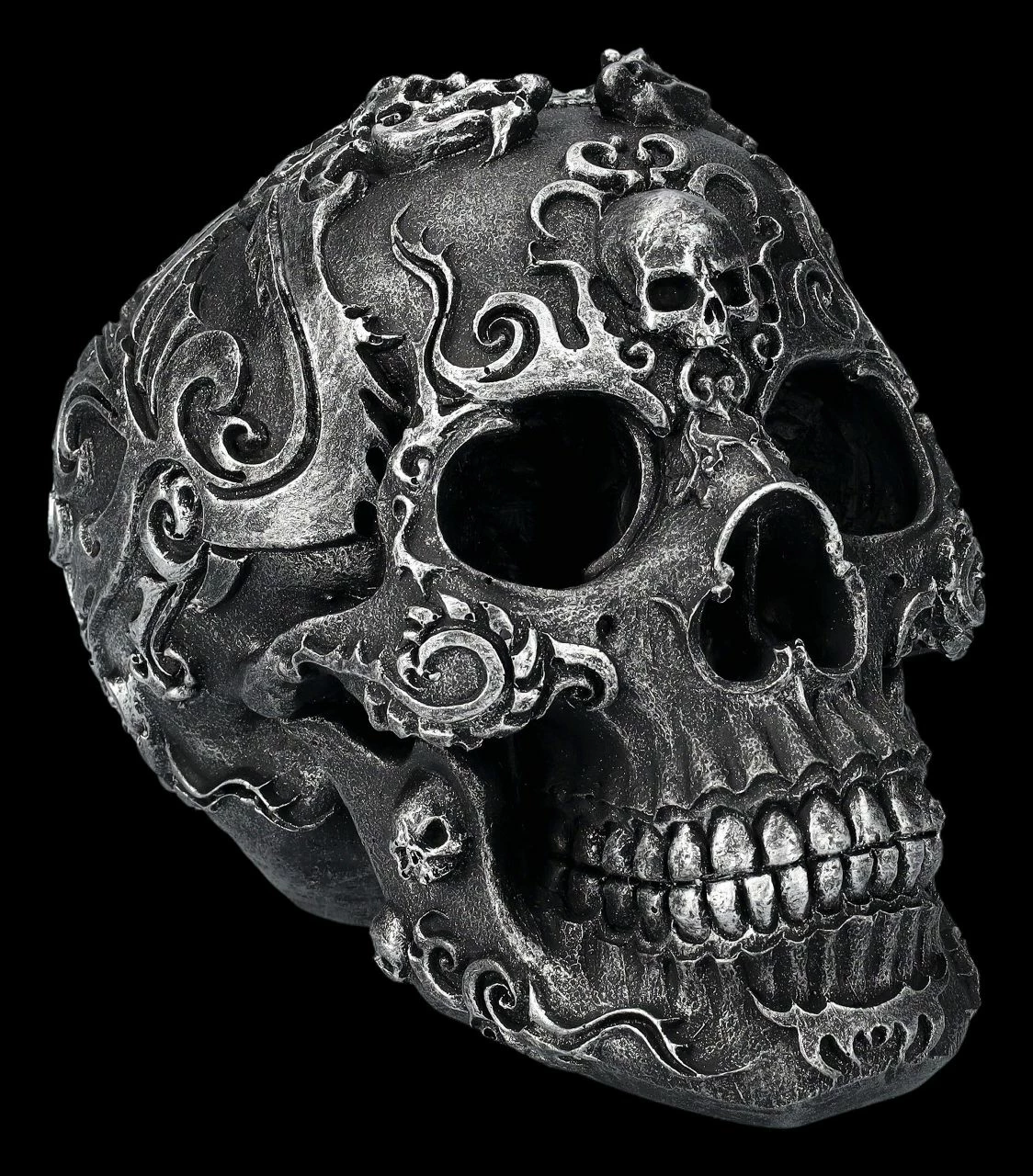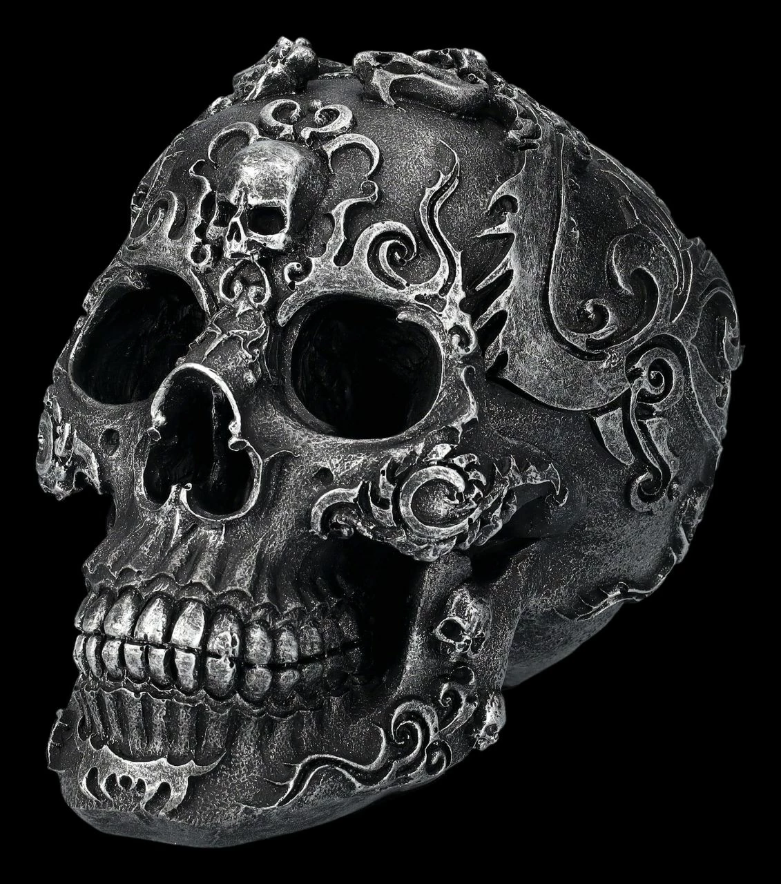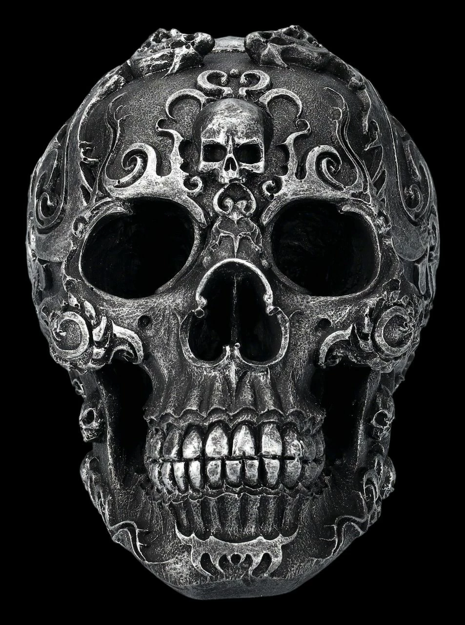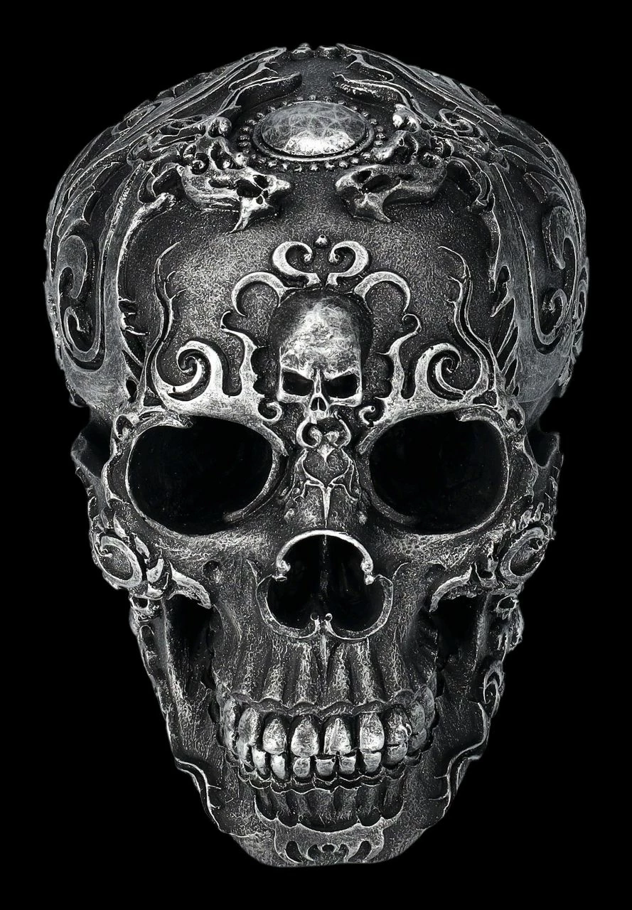 Die fantastischen Verzierungen dieses schwarzen Totenkopfes wirken beinahe wie aus Metall. Auf der Schädelbasis des Gothic Skull ist eine mit einem Strahlenkranz umgebene runde Platte, die wie eine Sonne das Zentrum des Musters bildet. Der 13 cm hohe, 11,5 cm breite und 17 cm tiefe Totenschädel wurde sehr detailreich aus handbemaltem Kunststein (Polyresin) gefertigt. Er ist eine tolle Ergänzung für jede Sammlung.