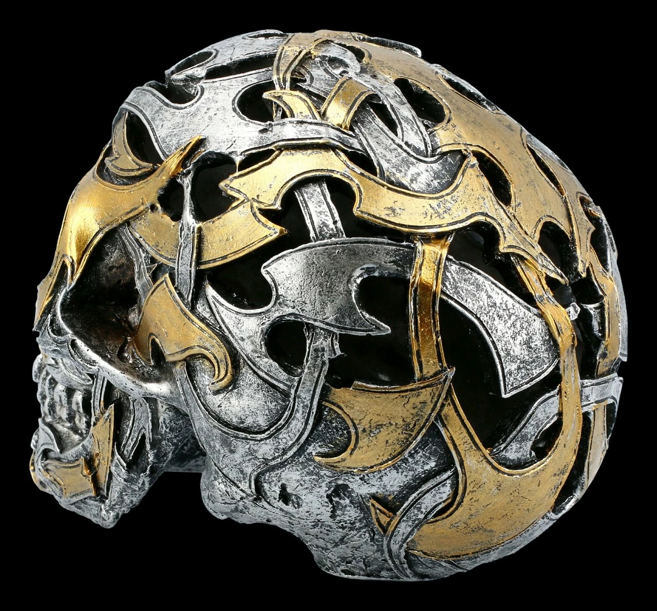 Der in Silber und Gold handbemalte Totenkopf besteht aus lauter Tribals und wirkt, als wäre er aus Metall geschmiedet. Der große detailreiche Schädel aus Kunststein (Polyresin) besticht durch sein außergewöhnliches Design und ist mal etwas ganz anderes. Er sollte in keiner Totenkopf Sammlung fehlen.