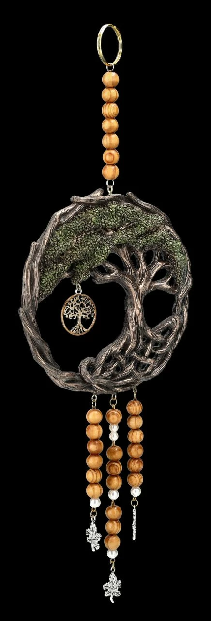 Die Wurzeln von Yggdrasil, der Weltesche aus der nordischen Mythologie, bilden bei diesem wunderschönen Traumfänger einen Kreis, der den germanischen Lebensbaum umrahmt. Das in den Zweigen hängende Medaillon zeigt ebenfalls den Lebensbaum. Der wunderbare, 32,5 cm hohe, 12,5 cm breite und 1,5 cm tiefe Traumfänger aus der Studio Collection von Veronese ist außerordentlich detailreich aus Kunststein (Polyresin), Metall, Holz und Holzperlen gearbeitet. Er wirkt auch durch die Bronzierung und feine Colorierung sehr effektvoll und dekorativ. Der außergewöhnliche Traumfänger ist auch ein sehr schönes Geschenk