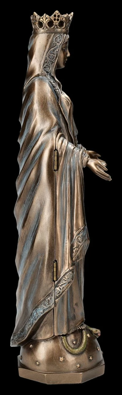 Eine Schlange windet sich um eine mit Sternen besetzte Halbkugel, auf der eine wunderschöne Marienstatue steht. Wenn man diese 28,5 cm hohe, 9,5 cm breite und 7,5 cm tiefe Marienfigur öffnet, entdeckt man einen 17,5 cm breiter Flügelaltar. In dem Triptychon-Flügelaltar ist in der Mitte die Szene zu sehen, wie Maria den sterbenden Jesus auf ihrem Schoß hält. Aus seiner Hand tropft Blut in einen Krug am Boden. Begleitet wird die Szene durch die Marienfigur auf der rechten Seite und einer ‚Gesegnetes Herz Jesus‘-Figur auf der linken Seite. Der Triptychon Flügelaltar mit der Pieta ist wunderbar detailreich aus hochwertigem und edel bronziertem Kunststein (Polyresin) gefertigt und wurde sehr schön und zurückhaltend coloriert. Er stammt aus der Studio Collection von Veronese und ist eine wunderschöne Darstellung der Pieta.
