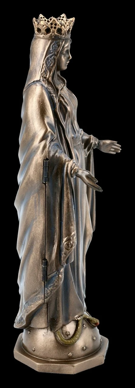 Öffnet man diese wunderschön gearbeitete Figur der Heiligen Mutter Maria, sieht man einen Flügelaltar. In dessen Mitte wird die Pieta dargestellt, bei der Jesus vom Kreuz abgenommen und in den Schoß der Mutter gelegt wird. Auf einer Seite steht die betende Maria und auf der anderen Seite der segnende Jesus. Der detailverliebte Flügelaltar aus bronziertem und coloriertem Kunststein (Polyresin) mit dem Pieta Motiv ist eine wunderbare religiöse Ergänzung. Der Tischaltar ist aus dem Haus Veronese und gehört zur Serie The Holy Journey.