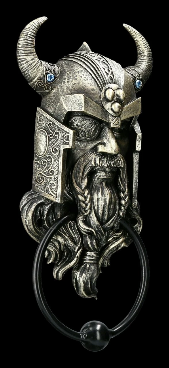 Etwas Mut und Selbstvertrauen gehört schon dazu, wenn man es wagt, unter dem beobachtenden Blick des Gottes Odin den Türklopfer zu bewegen. Der fantastische Türklopfer mit dem germanischen Gott ist beeindruckend detailreich aus handbemaltem Kunststein (Polyresin) und Metall gefertigt. Falls Sie ihn nicht an Ihrer Haustür anbringen können, so bewacht er mit seiner Höhe von 23 cm, der Breite von 11,5 cm und der Tiefe von 4 cm auch perfekt eine Tür zu Ihrem sehr persönlichen Bereich in Ihrem Zuhause.