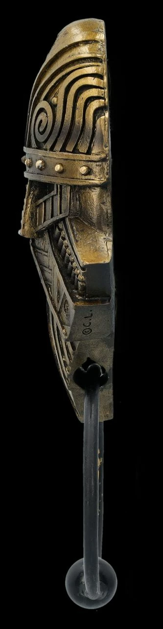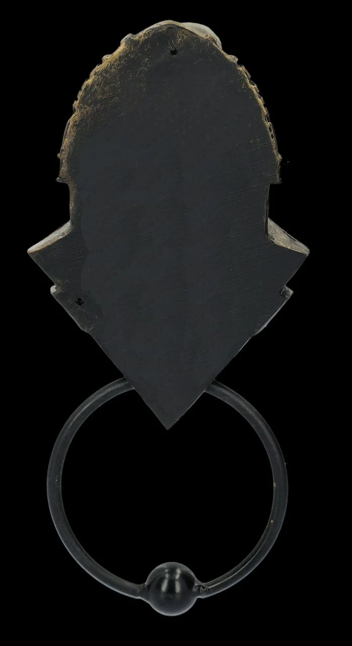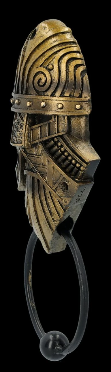 Dieser elegante Türklopfer mit dem stilisierten behelmten Kopf eines bärtigen Wikingers ist ein perfektes Geschenk für Wikinger. Der prächtige Türklopfer ist detailreich aus Kunststein (Polyresin) und Metall gefertigt und wurde mit den goldenen Akzenten sorgfältig von Hand bemalt. Er ist 23,5 cm hoch, 11 cm breit und 4 cm tief und schmückt mit seinem beeindruckenden Wikinger Look stilvoll jede Tür.