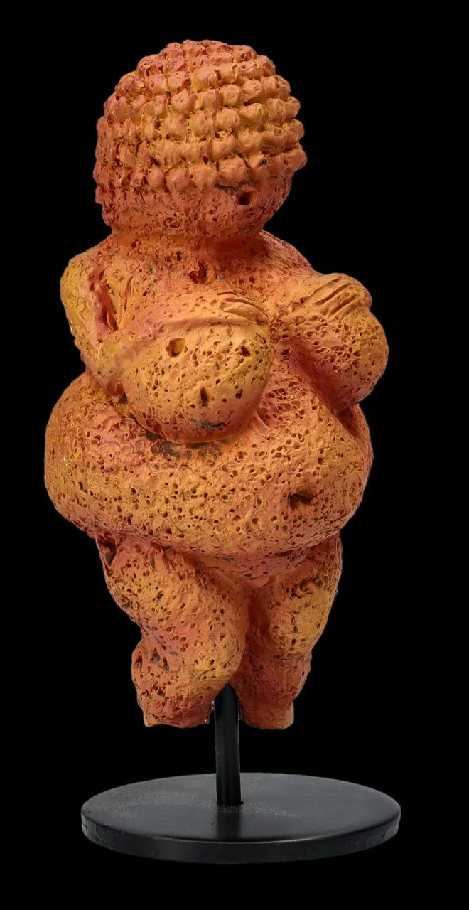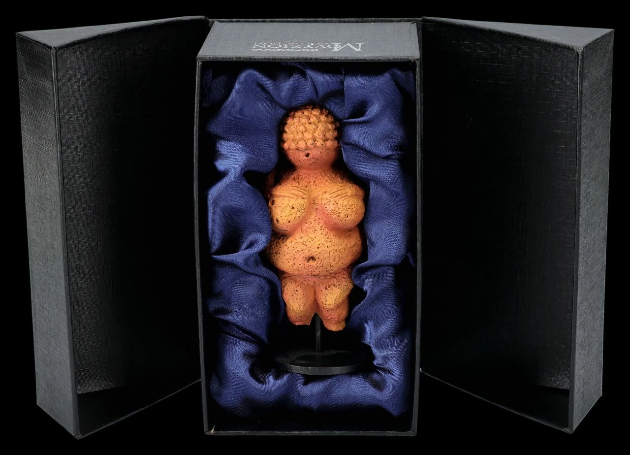 Diese wunderbare Miniaturskulptur, auch Pocket Art genannt, stellt das in Österreich im Jahr 1908 ausgegrabene und wohl berühmteste und älteste Artefakt dar – die Venus von Willendorf. Die Original-Figur, die im Naturhistorischen Museum von Wien bewundert werden kann, stellt Wissenschaftler bis heute vor ein Rätsel. Man nimmt an, dass sie als Fruchtbarkeitssymbol gedacht war. Unsere 10 cm hohe, 4 cm breite und 4,5 cm tiefe Figurine der Venus von Willendorf aus sorgsam handbemaltem Kunststein (Polyresin) ist der gefundenen Skulptur nachempfunden und ein perfektes Geschenk für Sammler berühmter Kunstwerke